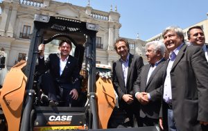 El Intendente de la Región Metropolitana, Claudio Orrego, junto a consejeros regionales y alcaldes, participó este miércoles de la entrega de 66 vehículos que vienen a reforzar el trabajo de los municipios en emergencias relacionadas a la escasez hídrica, temas de microbasurales y medio ambiente, entre otras.