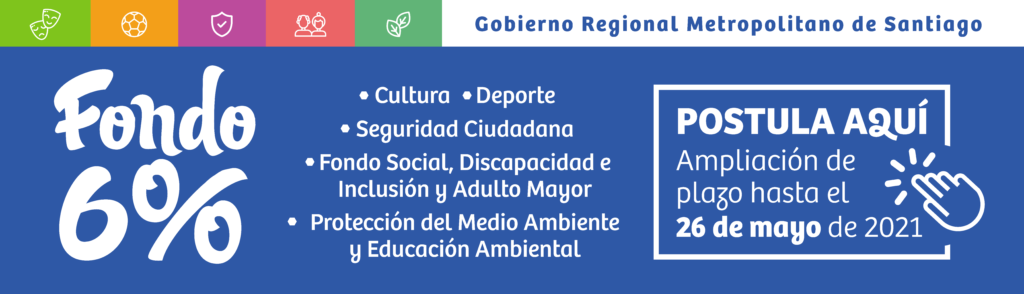 22 de Abril de 2021.- Se amplió el plazo para las postulaciones al Fondo 6% FNDR 2021 del Gobierno Regional Metropolitano. Por otros 30 días más, hasta el próximo 26 de mayo, los ciudadanos podrán postular en 5 categorías: Cultura; Deporte; Seguridad Ciudadana; Fondo Social, Discapacidad e Inclusión y Adulto Mayor, y Protección del Medio Ambiente y Educación Ambiental.