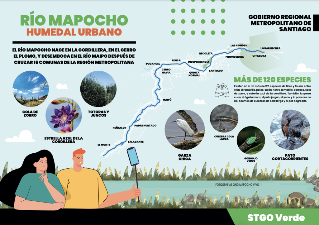 El río Mapocho es vital para mantener el ciclo hidrológico para cuenca del Maipo y es el principal corredor biológico de la ciudad de Santiago. Transita por 16 comunas, desde la pre cordillera, en Lo Barnechea, hasta su confluencia con el río Maipo en El Monte. Entre los beneficios del Río destaca su capacidad de minimizar las inundaciones, además de brindar espacios para conectar con la naturaleza y compartir en comunidad.