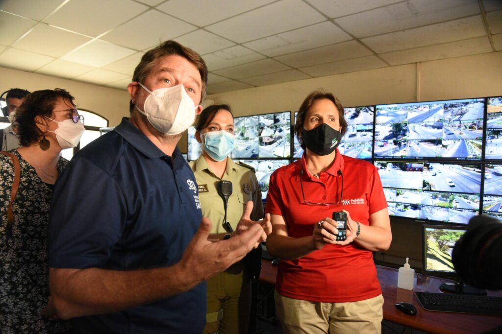 Santiago, 25 de noviembre de 2021.– En el marco del Día Internacional de la Eliminación de la Violencia contra la Mujer, esta mañana la alcaldesa Carolina Leitao y el Gobernador de la Región Metropolitana, Claudio Orrego, hicieronun recorrido por la Central de Cámaras Municipales que se ubicaal interior de la 43° Comisaría de Peñalolén, donde revisaron en terreno la operatividad del “Programa SOS Mujer”. La iniciativa, galardonada por los Premios Avonni 2021 en la categoría Innovación, busca prevenir episodios de violencia intrafamiliar y de género en la comuna.