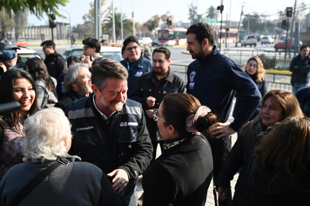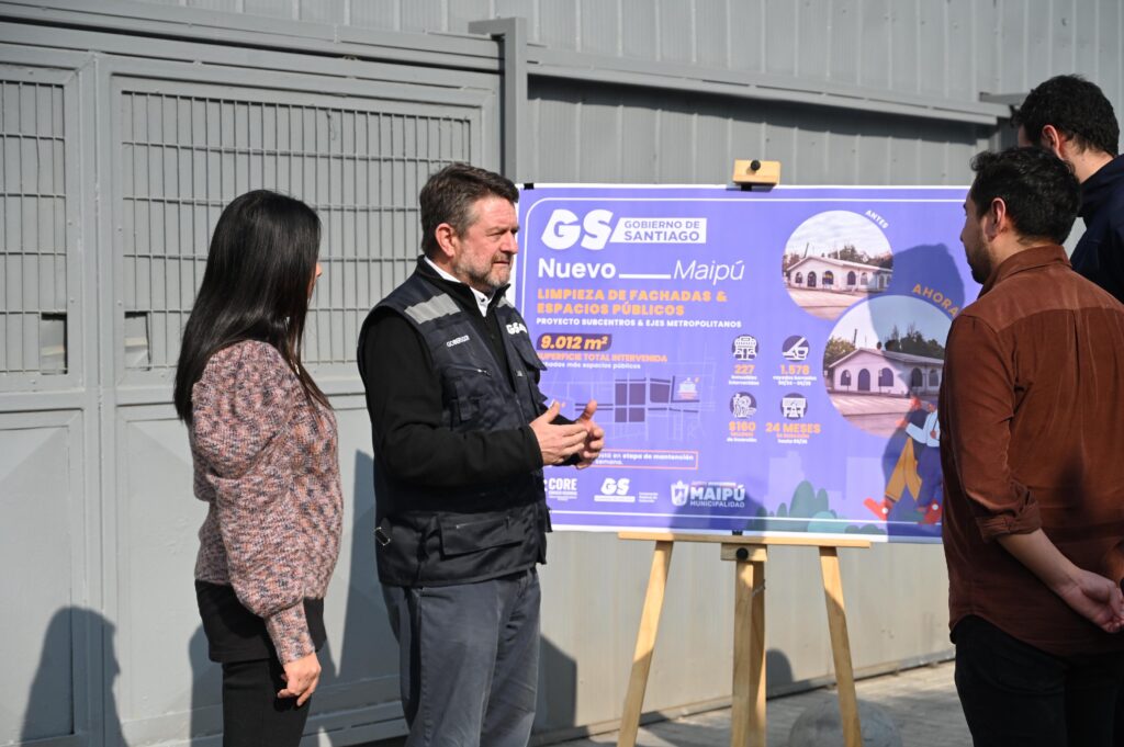 Santiago, 04 de junio de 2025.- Con el fin de mejorar los espacios públicos y recuperar la ciudad para las personas, el Gobernador de Santiago, Claudio Orrego, junto al alcalde de Maipú, Tomás Vodanovic, el consejero regional, Nicolás Jara, y la presidenta de la Junta de Vecinos del Barrio Pajaritos Sur, Patricia Correa, realizaron un positivo balance del proyecto “Recuperación de Sub Centros y Ejes Metropolitanos” en la comuna, donde se intervinieron las fachadas de 227 inmuebles, borrando más de mil rayados en el centro histórico de la comuna.