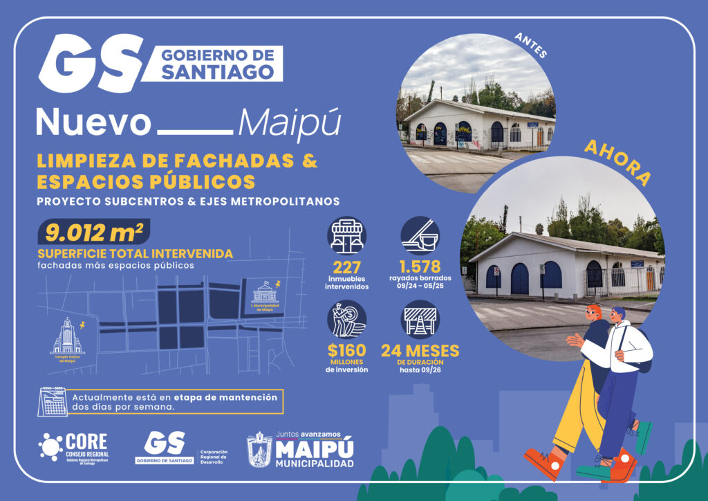 - En el marco del Programa de Limpieza y Mantención de Fachadas que impulsa el Gobierno de Santiago, en la comuna de Maipú se intervino una superficie de 9.012 m², con una inversión de $160.000.000, destinada a la limpieza inicial y posterior mantención de 277 inmuebles.