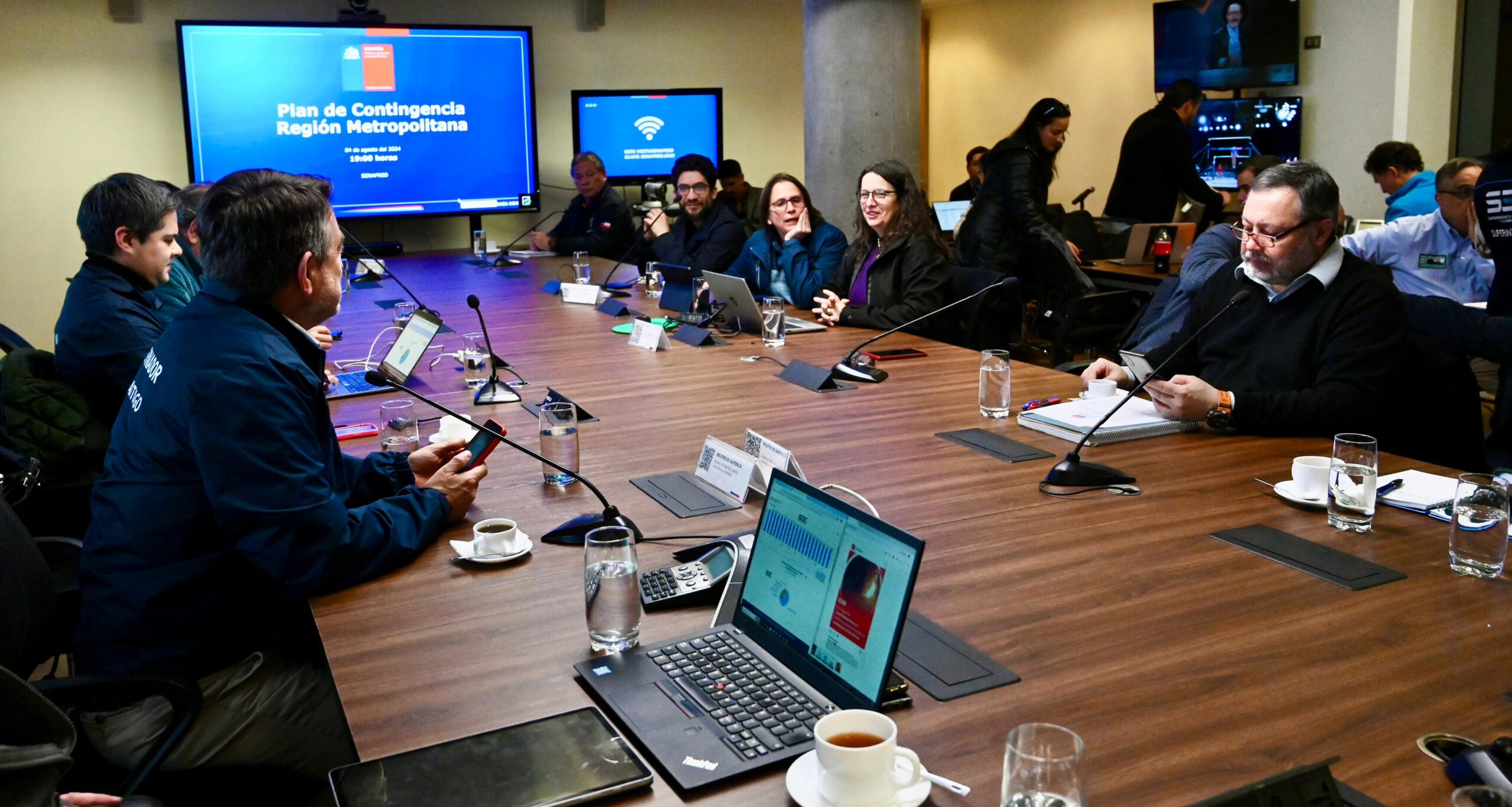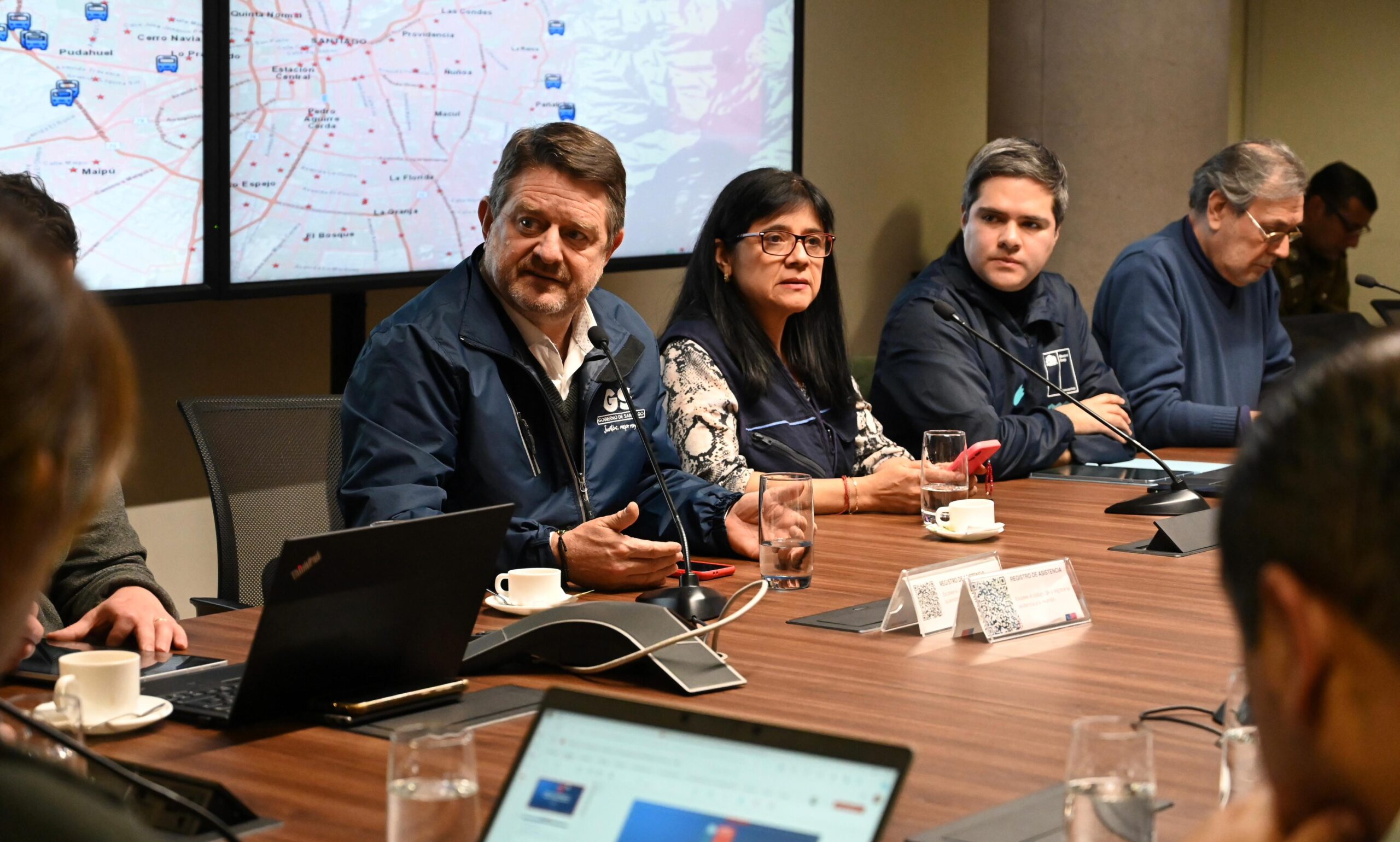 Santiago, 04 de agosto. – El Gobernador de Santiago, Claudio Orrego, se reunió la tarde de este domingo con autoridades nacionales y organismos técnicos en dependencias del Servicio Nacional de Prevención y Respuesta ante Desastres (SENAPRED) para realizar un balance, bajo el contexto del sistema frontal que dejó a más de 300 mil clientes sin luz en Santiago. Entre las autoridades que participaron destacan, el subsecretario del Interior, Manuel Monsalve, el ministro de Energía, Diego Pardow, el delegado presidencial, Gonzalo Durán, y la presidenta de la Asociación de Municipalidades Chilenas, Carolina Leitao.