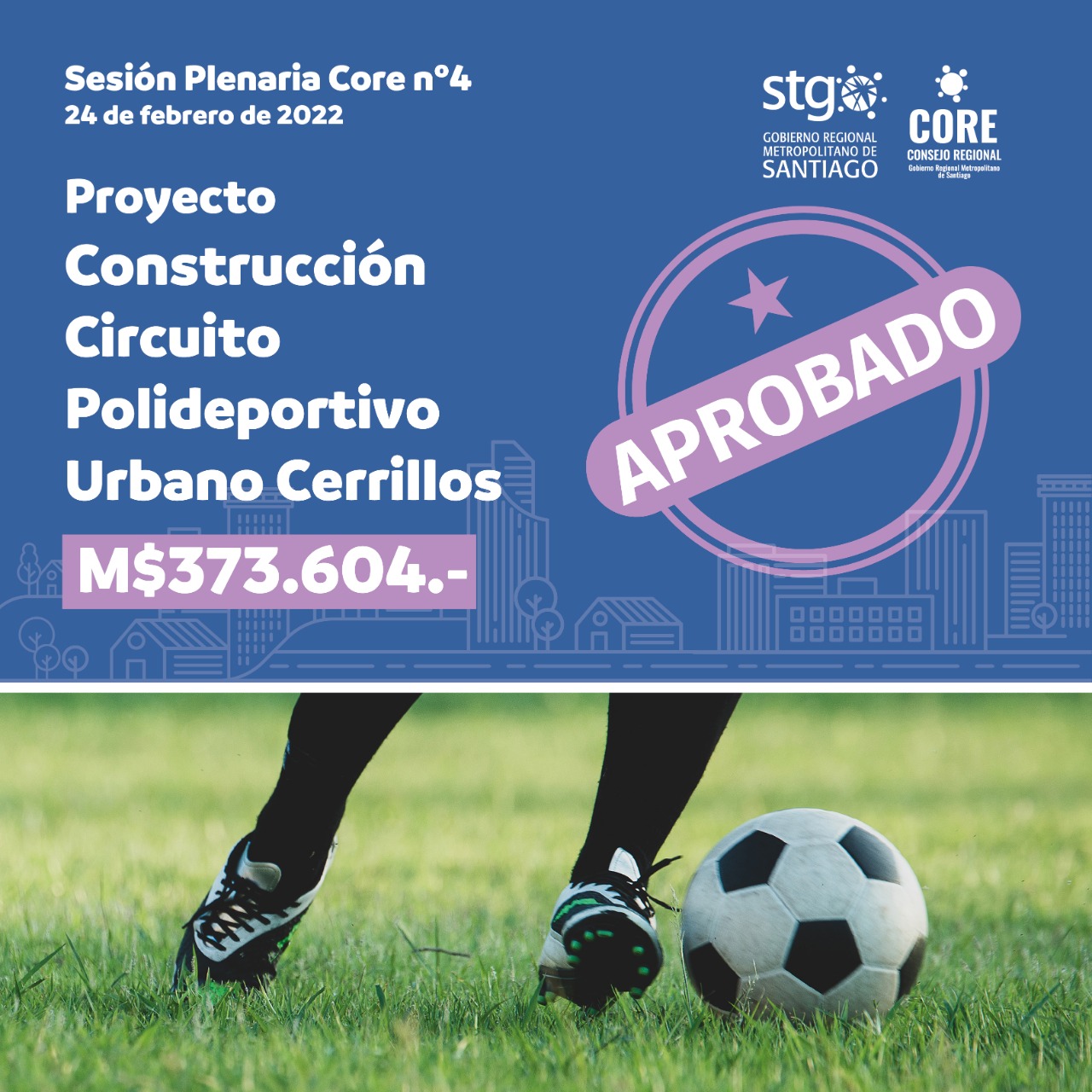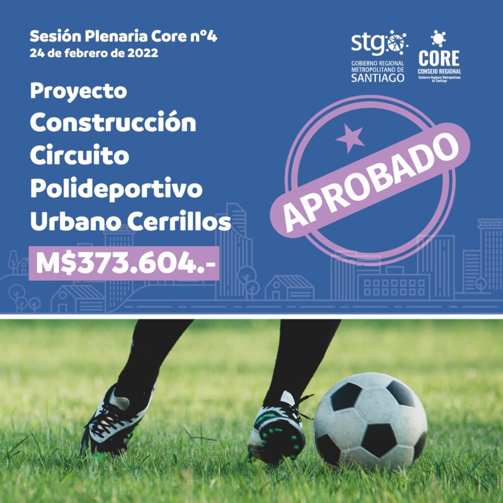 La segunda iniciativa aprobada en tabla corresponde a un Polideportivo en la comuna de Cerrillos, que tendrá un suplemento presupuestario de M$373 millones. Esto, se traduce en la construcción de zonas deportivas y de actividad física en una superficie de 10.921m2, distribuidos en multicancha, canchas de futbolito, circuitos de trote y ejercicios, pista de patinaje, muro de escalada, juegos infantiles, tenis de mesa, skatepark, pista de bicicross, entre otros. Además, el proyecto, incluye tanto superficies de apoyo como libres complementarias, tales como plaza de agua, áreas verdes, veredas, estacionamientos y circulaciones.