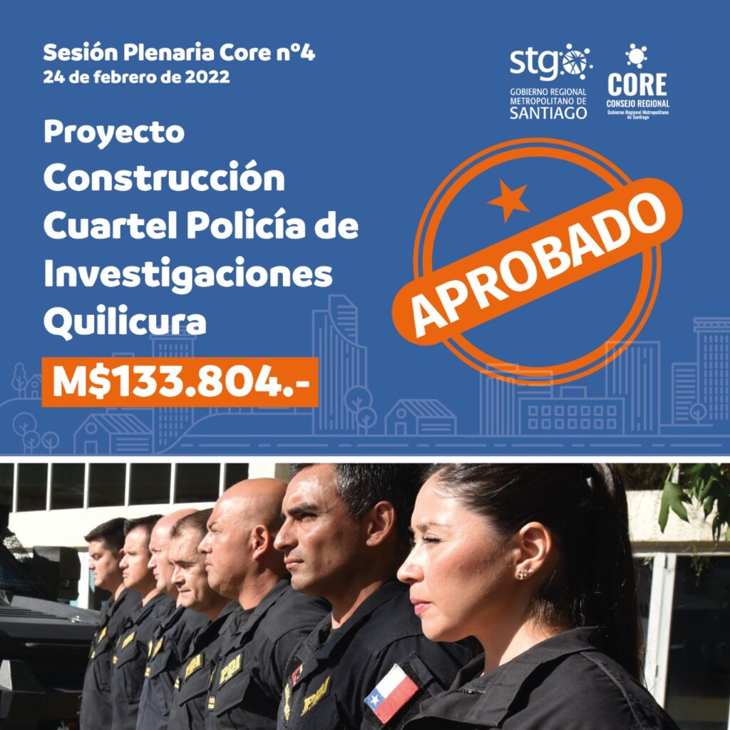 Se trata de la construcción de un Cuartel para la Policía de Investigaciones en la comuna de Quilicura, que recibirá M$133 millones de pesos extras. De esta manera, se podrá concretar la construcción de un recinto de 1.669 m2, que contempla una recepción, caseta de guardia, habitaciones, sala multiuso, servicios generales, entrenamiento y estacionamientos.