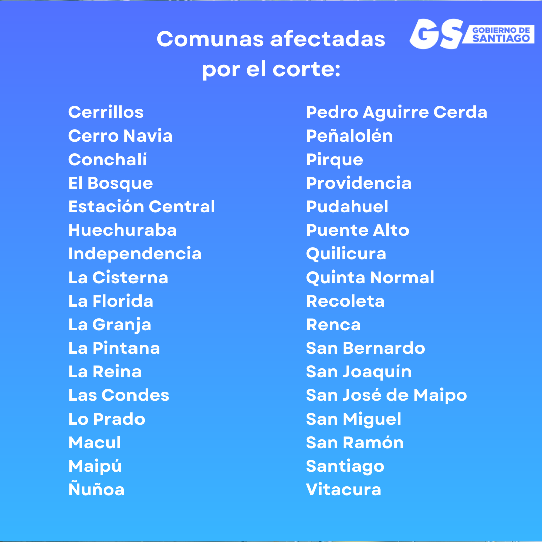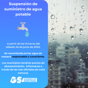 Santiago, 23 de junio de 2023.- Debido al sistema frontal que afecta a la Región Metropolitana con lluvias en altura que generaron turbiedad en los caudales de los ríos, Aguas Andinas informa de un corte temporal del suministro de agua potable que afectará a las siguientes 34 comunas de la Region Metropolitana, a partir de las 14:00 horas del sábado 24 de junio: