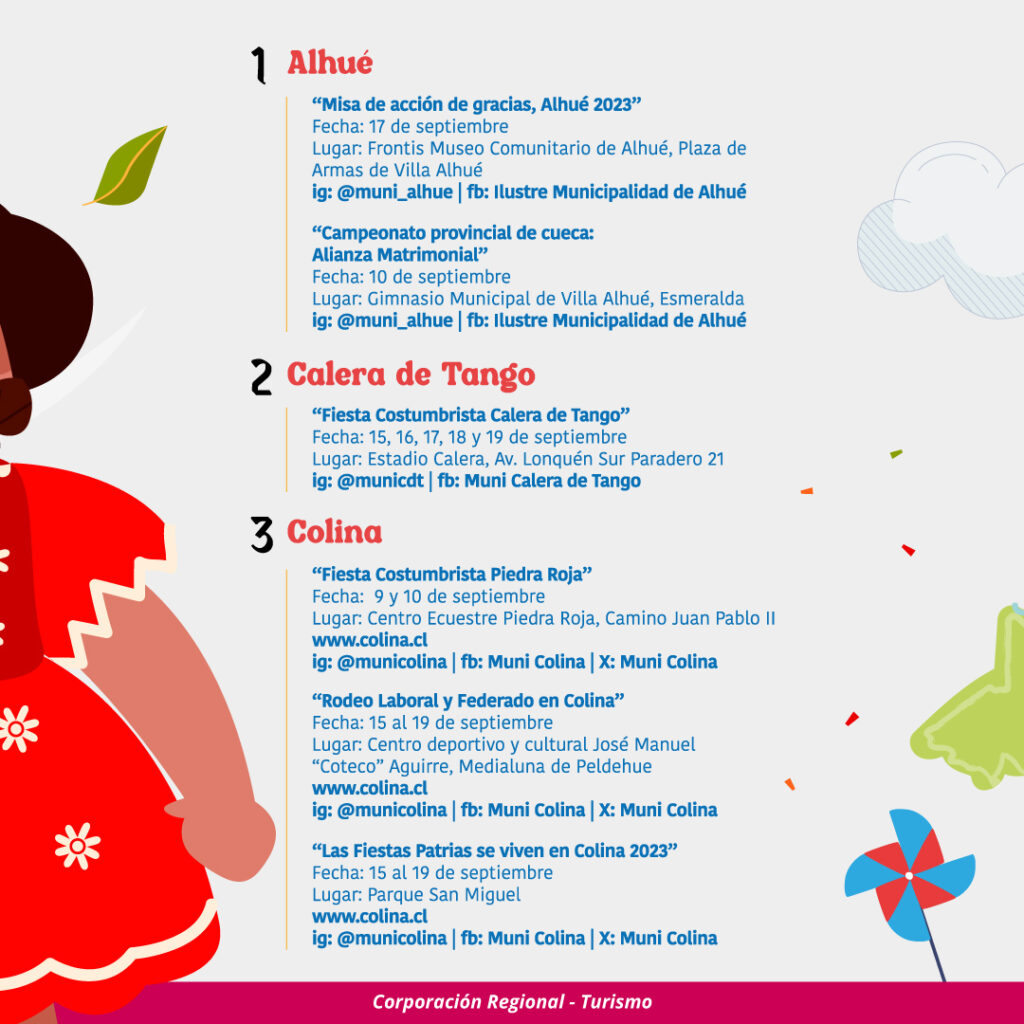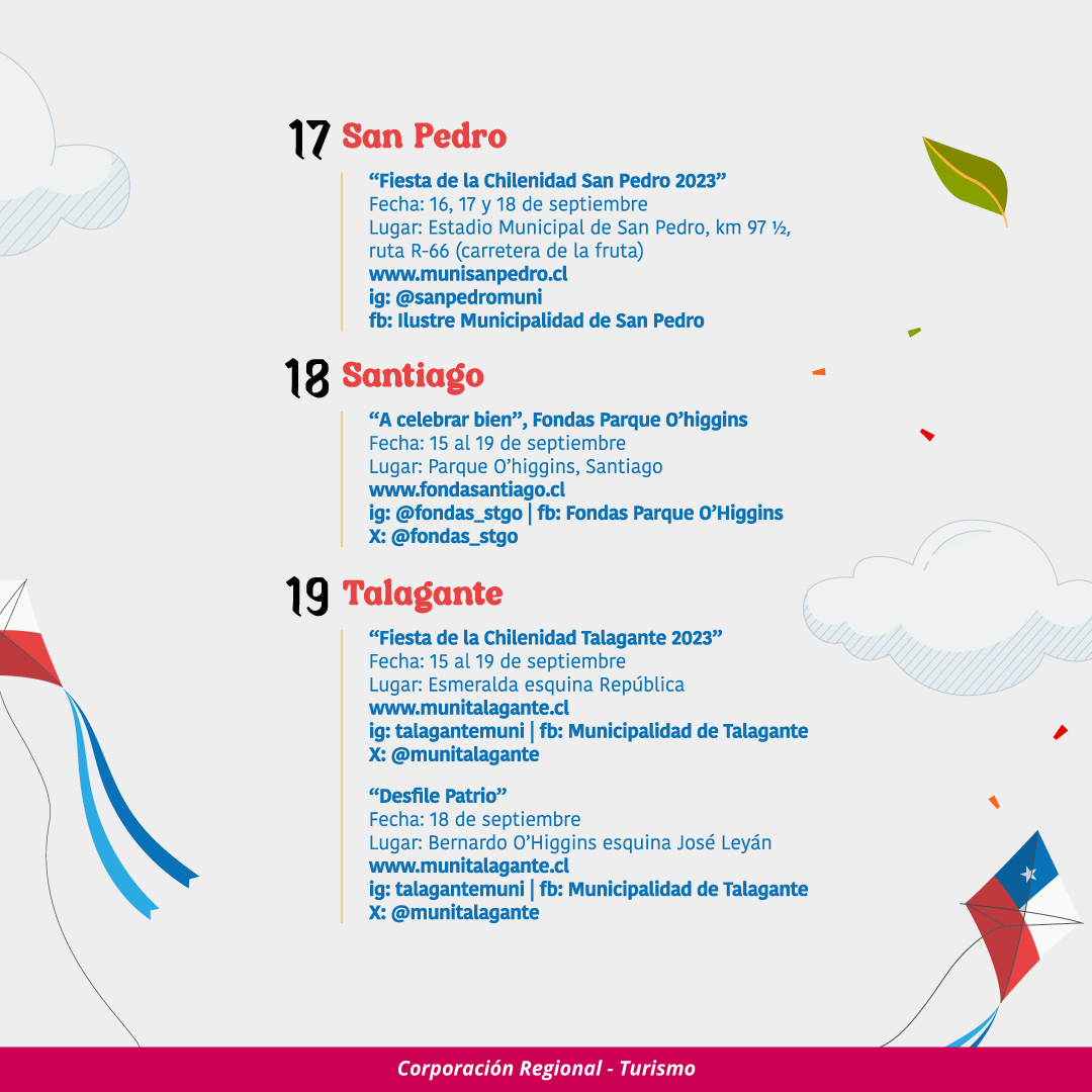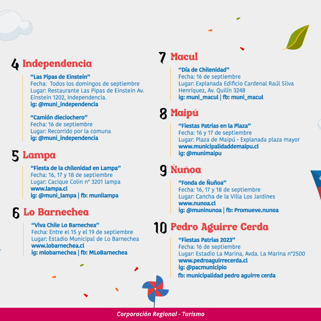 Santiago, jueves 14 de septiembre de 2023.– Este 18 de septiembre, la Región Metropolitana se viste de fiesta para conmemorar las Fiestas Patrias de Chile. Infórmate de las numerosas opciones para celebrar en familia. Desde fondas y ramadas tradicionales hasta eventos culturales y espectáculos de música folclórica, la Región Metropolitana ofrece una amplia gama de actividades para todos los gustos.