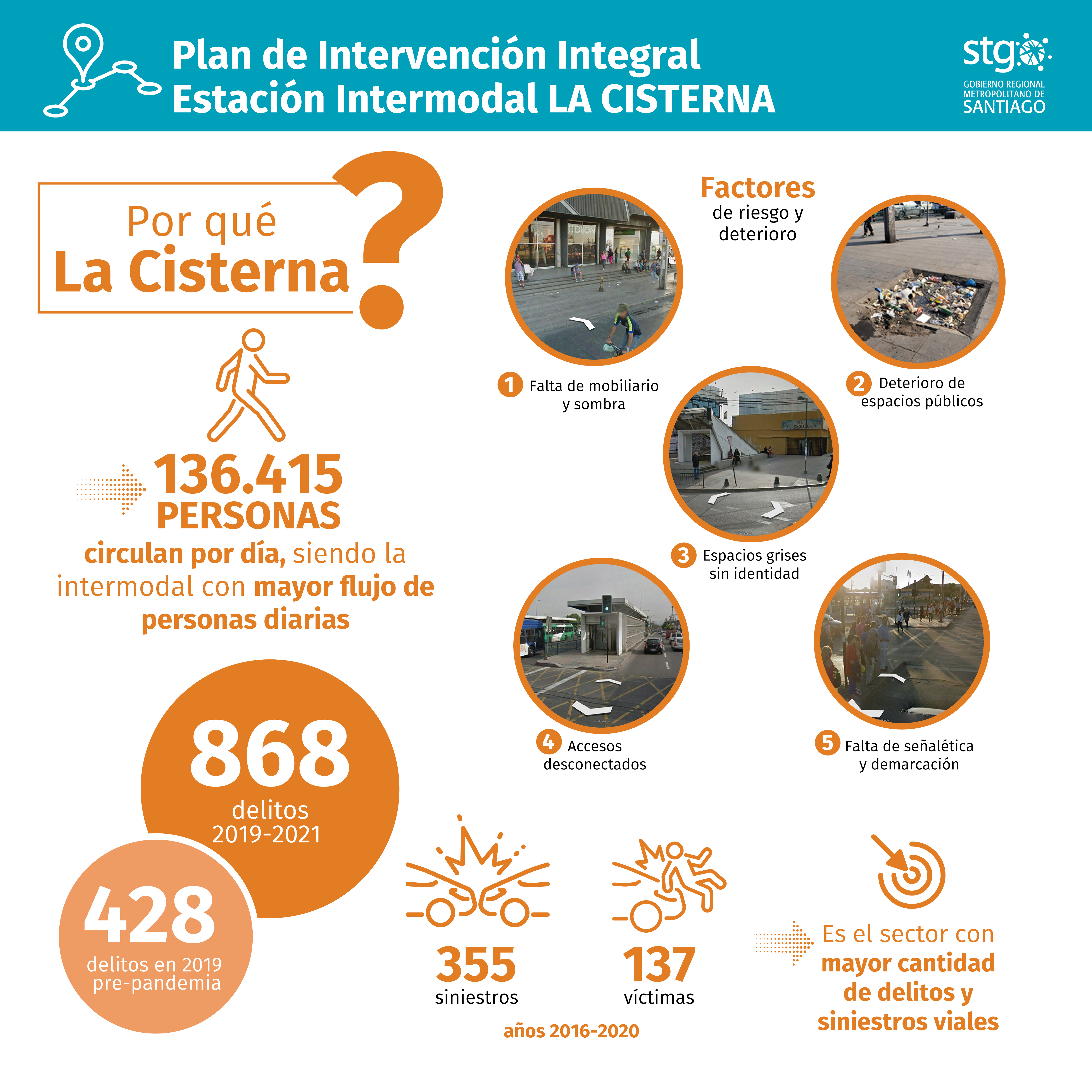 En accidentabilidad, los siniestros de tránsito registrados en el cuadrante de la Intermodal de La Cisterna en los últimos 5 años registran un total de 355 siniestros y 137 víctimas.  En delitos e inseguridad, durante el año 2019 pre-estallido y pandemia, la Intermodal de La Cisterna concentró un total de 428, mientras que los casos policiales alcanzaron -entre los años 2019-2021- un total de 868.