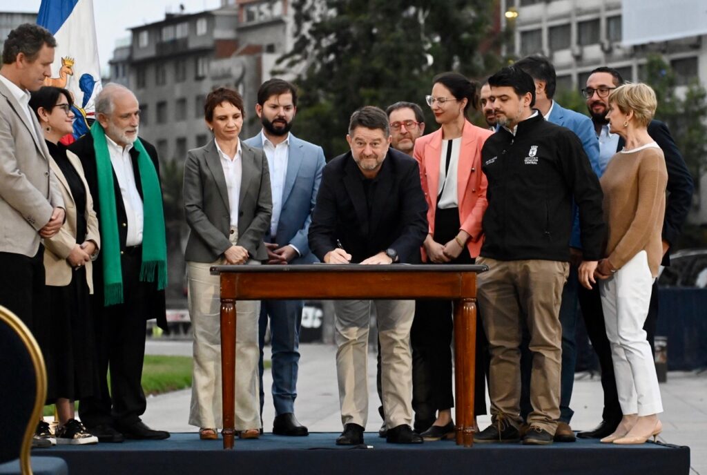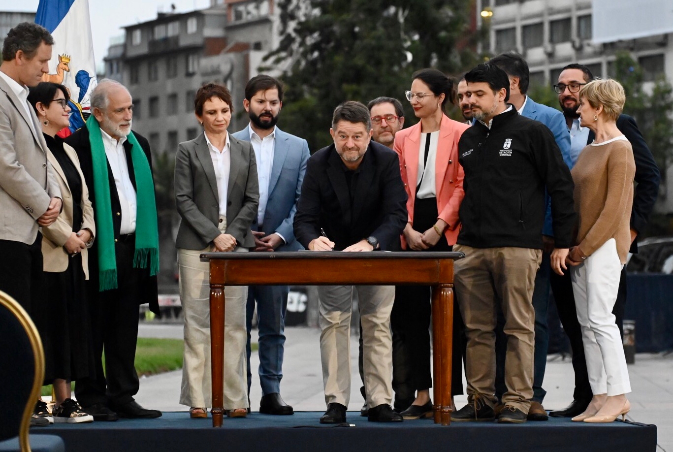 Santiago, 26 de diciembre de 2022.- Esta mañana el Presidente Gabriel Boric, acompañado por el gobernador de la Región Metropolitana, Claudio Orrego, junto a ministros de Estado, más los alcaldes y alcaldesas de Santiago, Providencia, Estación Central y Lo Prado, firmó el convenio de cooperación pública que permitirá reactivar el año 2023 el proyecto de recuperación y transformación del eje Alameda-Providencia, desde Pajaritos a Plaza Italia.