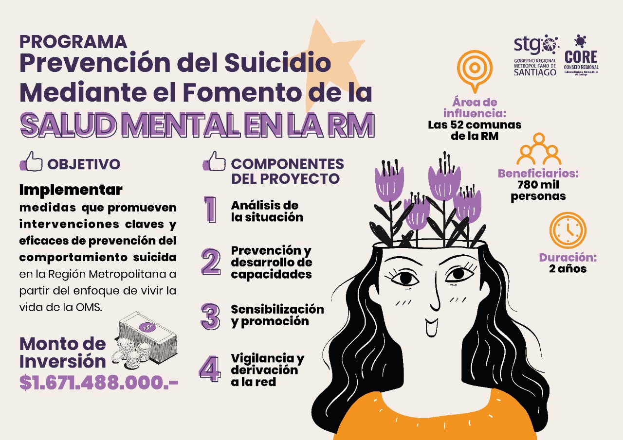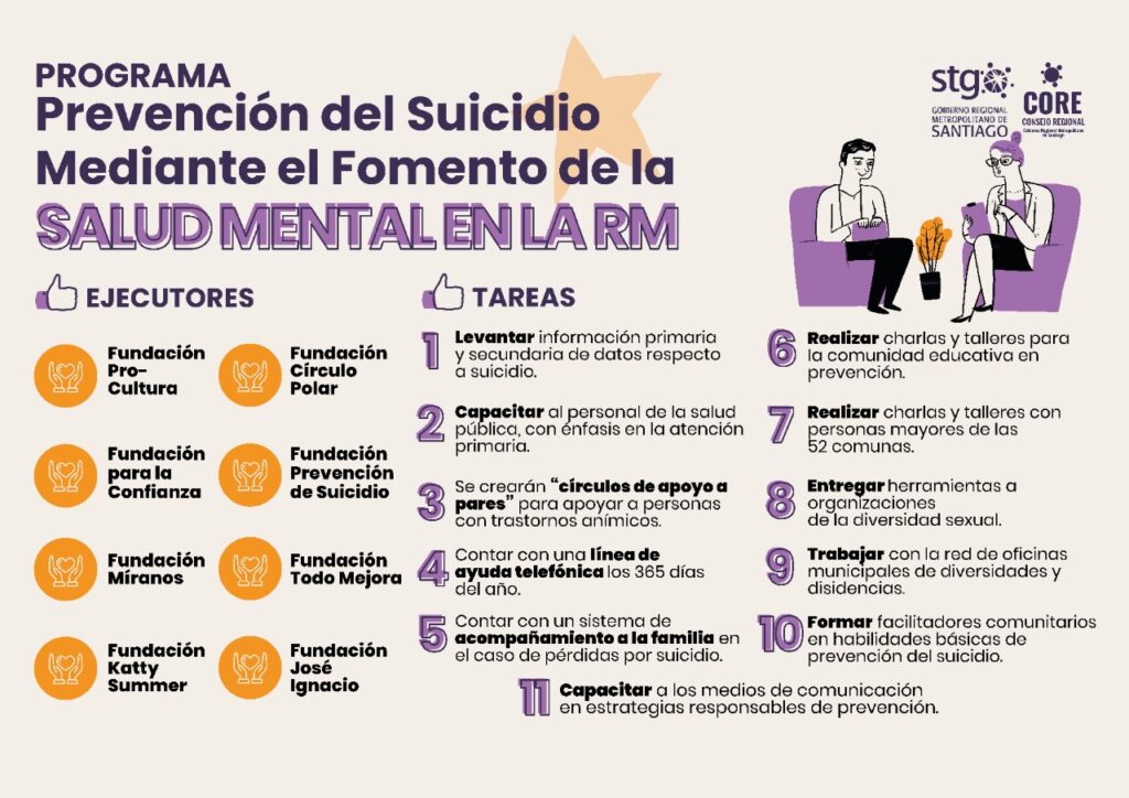 El programa durará 2 años, se ejecutará en las 52 comunas de la capital y se espera beneficiar a más de 780 mil personas. La iniciativa cuenta con el impulso de 8 fundaciones ligadas al tema: Fundación Pro-Cultura, Fundación para la Confianza, Fundación Míranos, Fundación Todo Mejora, Fundación Katty Summer, Fundación José Ignacio, Fundación Círculo Polar y Fundación Prevención de Suicidio, más el apoyo de la Seremi de Salud de la RM.