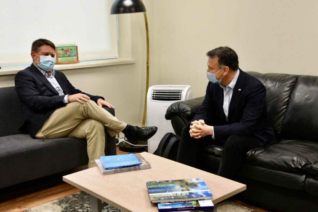 Santiago, 8 de octubre de 2021.- Un primer encuentro protocolar sostuvieron este viernes el nuevo delegado presidencial de la Región Metropolitana, Emardo Hantelmann, y el Gobernador Metropolitano Claudio Orrego. Entre los acuerdos tomados, está establecer una agenda de trabajo conjunta que vaya en beneficio de los ciudadanos y ciudadanas la de la región.