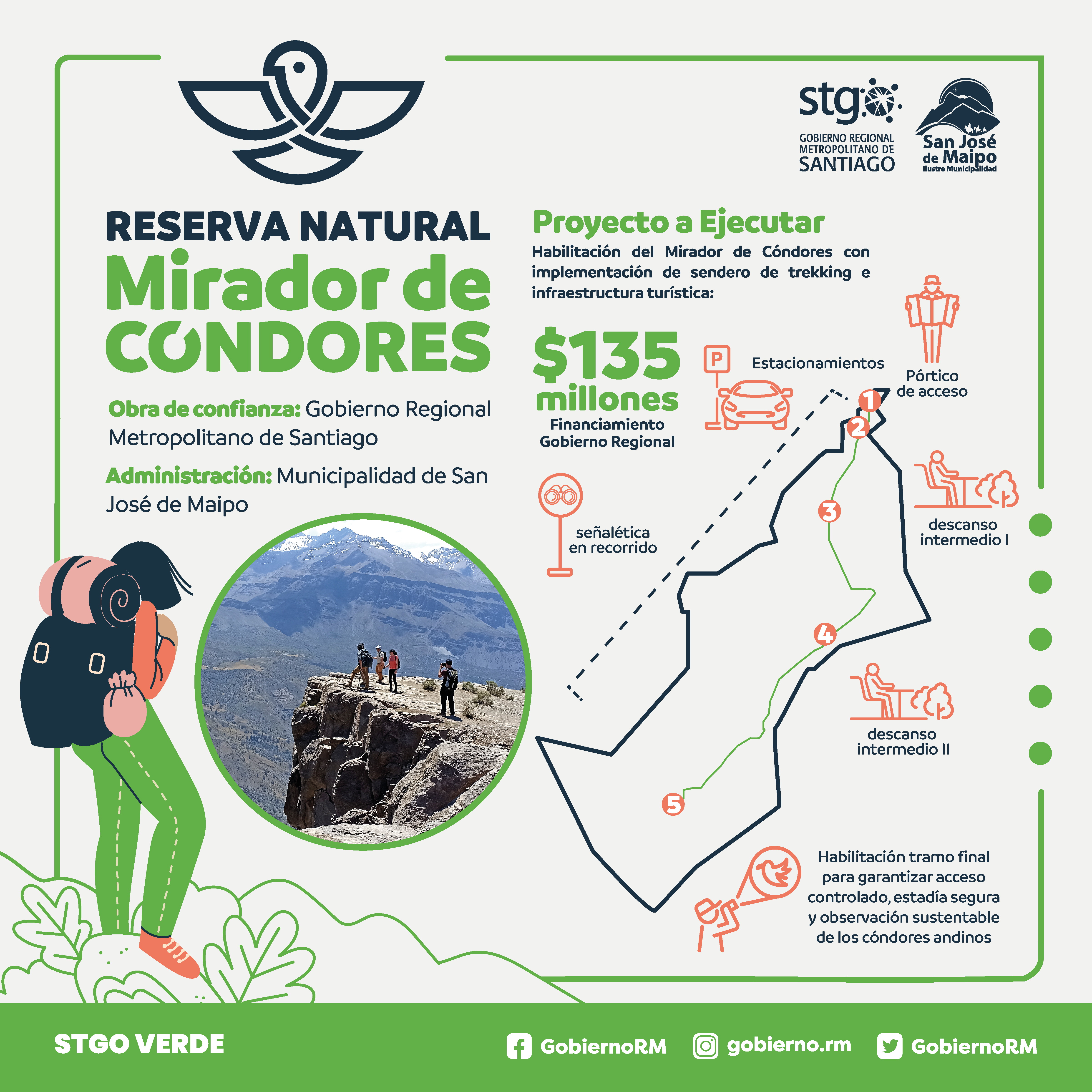 “El Gobierno Regional financiará con $135 millones la habilitación del Mirador de Cóndores, con nuevos accesos, lugares de descanso, estacionamientos, y mejoras en la seguridad del lugar, para que el mirador sea parte de la oferta turística sustentable de San José de Maipo y de la región. Ya tenemos el diseño, se trabajó con las comunidades, y ahora hay que licitar e implementar para que prontamente esté habilitado, de cara a la primavera y el verano”, agregó Orrego.