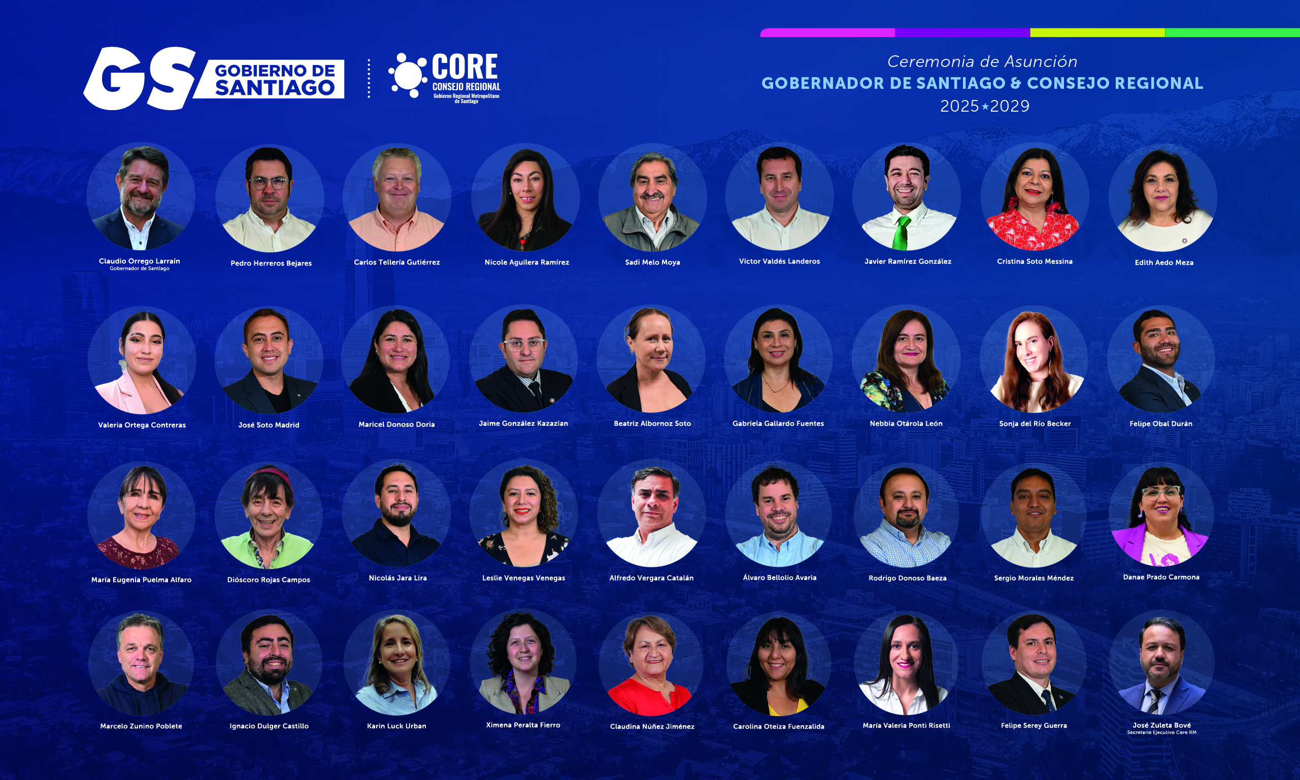 Respecto a la ceremonia de instalación del Consejo Regional (CORE) se realizó el juramento de los 34 consejeras y consejeros Regionales, quienes prometen cumplir las funciones de sus cargos y representar a la comunidad de la región, fiscalizando al ejecutivo del gobierno regional, a sancionar la estrategia regional de desarrollo y a trabajar por medio de sus comisiones, promoviendo el bienestar, crecimiento y desarrollo integral de toda la Región Metropolitana.