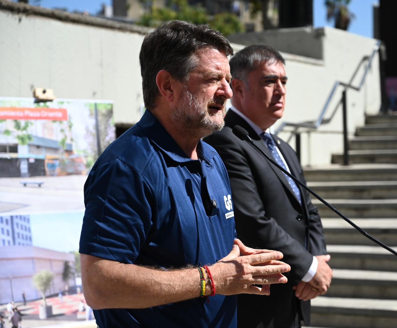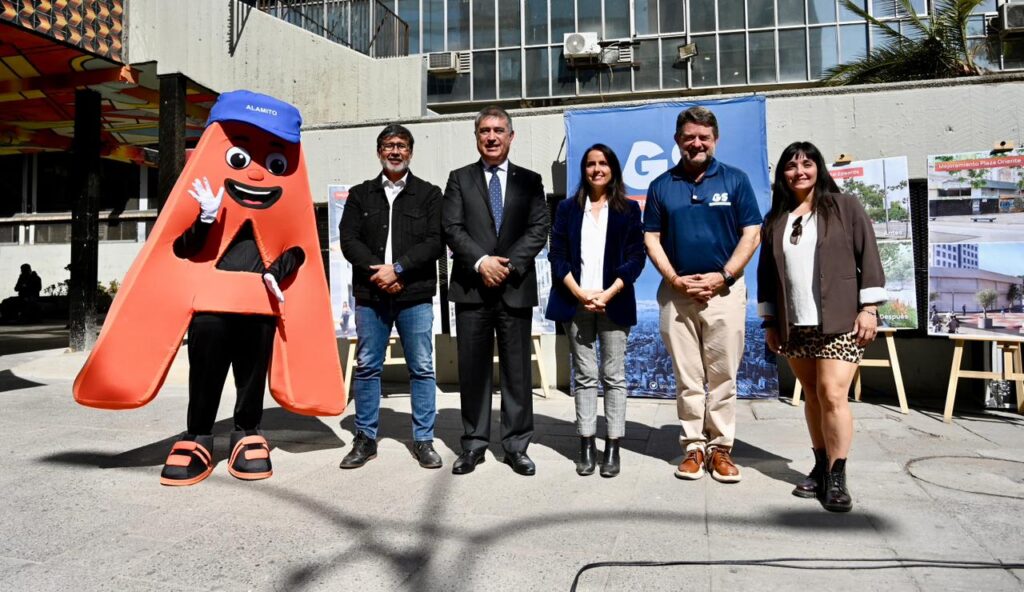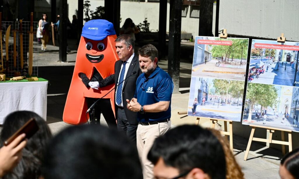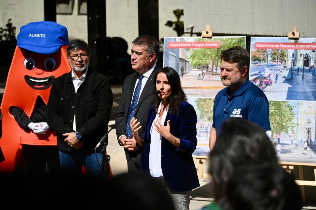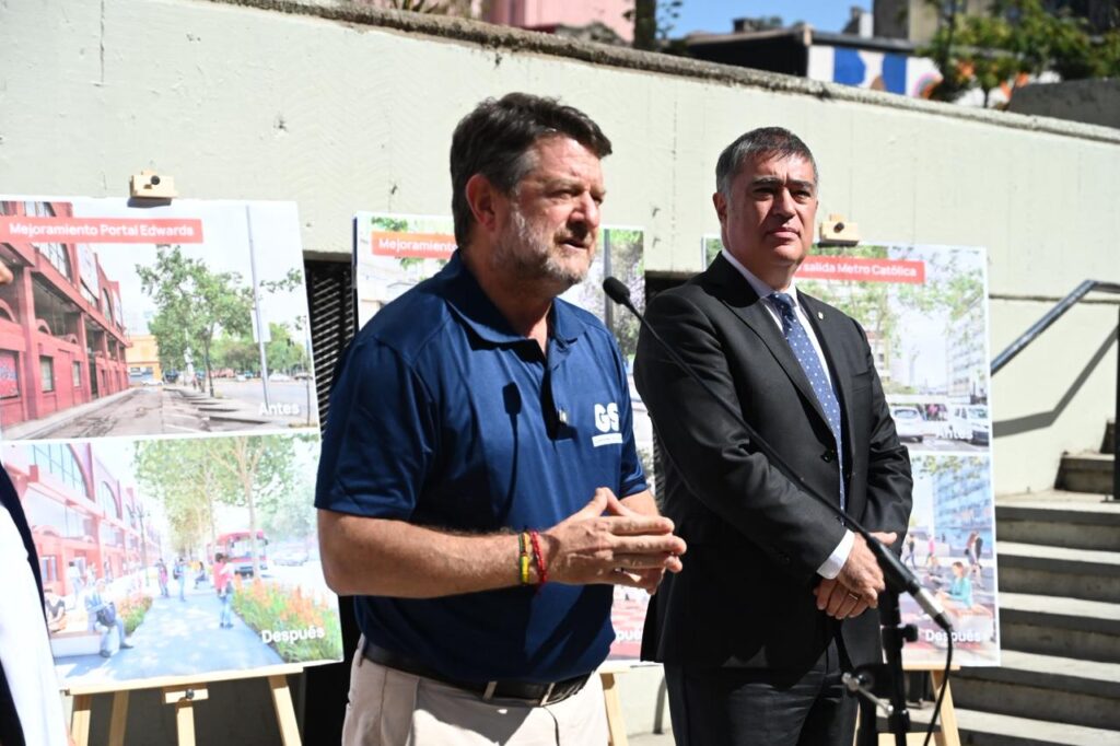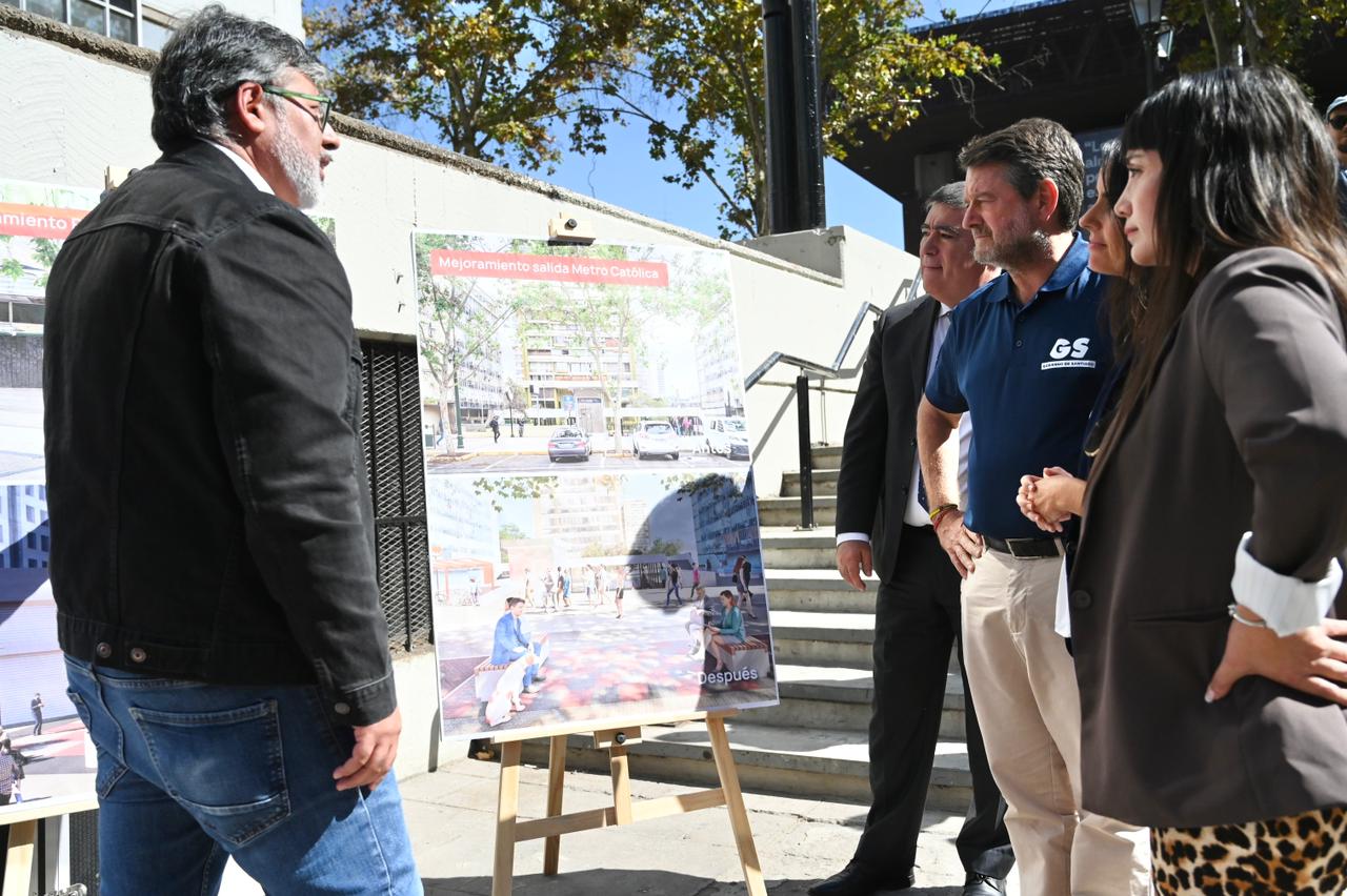 Lunes 6 de abril de 2026.-En la salida sur del metro Universidad Católica, el Gobernador de Santiago, Claudio Orrego, junto al alcalde de Santiago, Mario Desbores, y la decana de la Facultad de Arquitectura de la Pontificia Universidad Católica, Magdalena Vicuña, dio a conocer los nuevos trabajos que se están realizando en cinco puntos del eje Alameda: el Portal Edwards, la Plazoleta Gratitud Nacional, la misma salida sur del Metro Universidad Católica, la Plaza Tucapel Jimenez y la Plaza Oriente, entre Jaime Eyzaguirre y la Plaza de Carabineros.