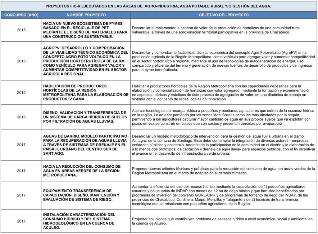 Revisa la nómina de Proyectos FIC-R ejecutados en los ámbitos de Agro-Industria, Agua Potable Rural y/o Gestión del Agua: