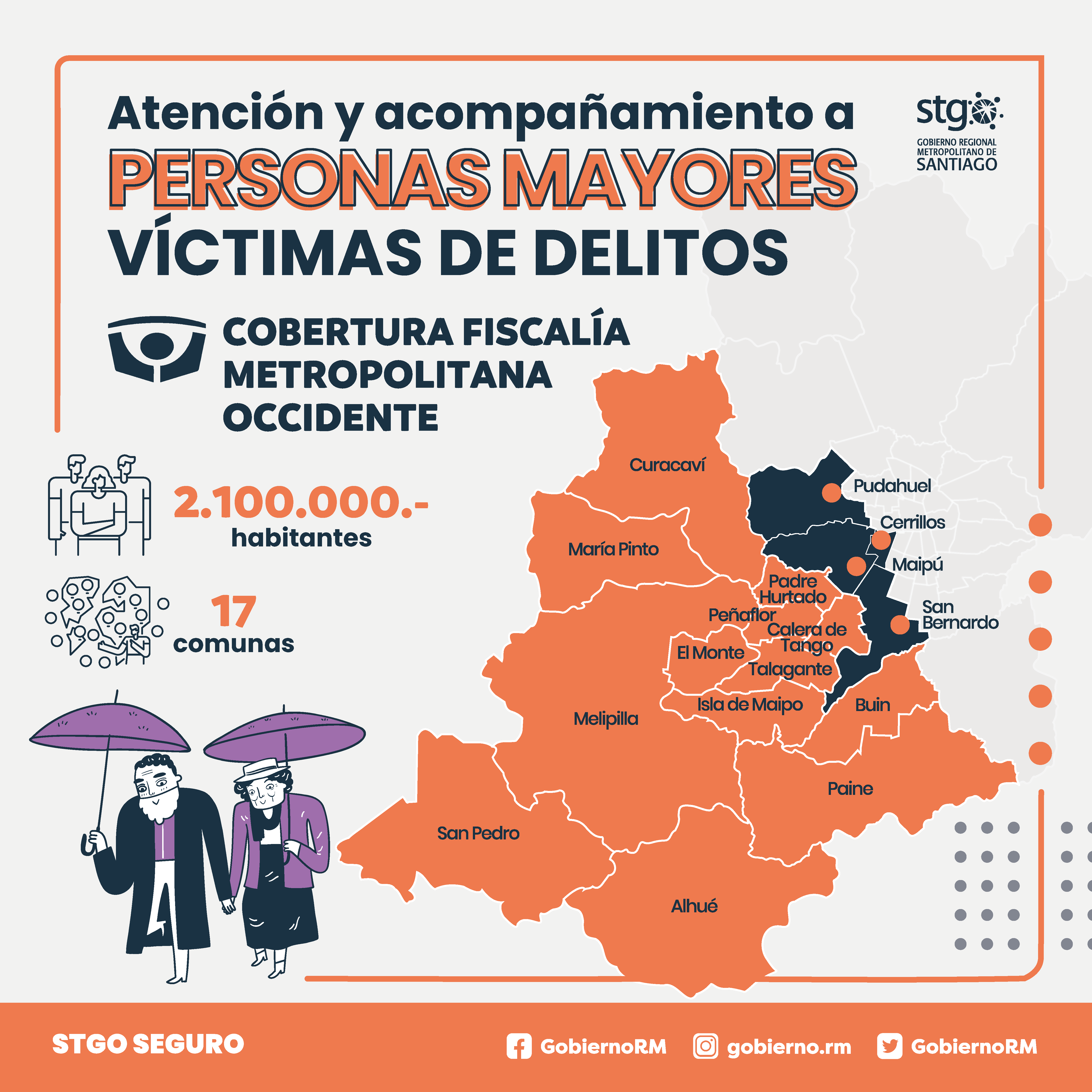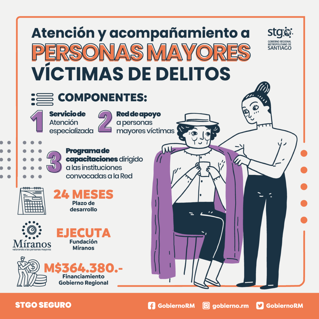 Se trata de una alianza inédita entre el Gobierno Regional de Santiago, la Fiscalía Regional Occidente, la Fundación de asistencia a personas mayores ‘Míranos’, y 17 municipios urbanos y rurales, entre ellos Maipú, San Bernardo, Cerrillos, Pudahuel, Melipilla, Talagante, Buin, Curacaví, y San Pedro. El programa posee tres componentes de ejecución: Servicio de Atención especializada a personas mayores derivadas desde Fiscalía Metropolitana Occidente; un programa de capacitaciones en temáticas relacionadas con el trabajo con personas mayores y víctimas de delito; y la puesta en marcha de una Red de apoyo con instituciones y entidades que se encuentran vinculadas a la atención de adultos mayores.