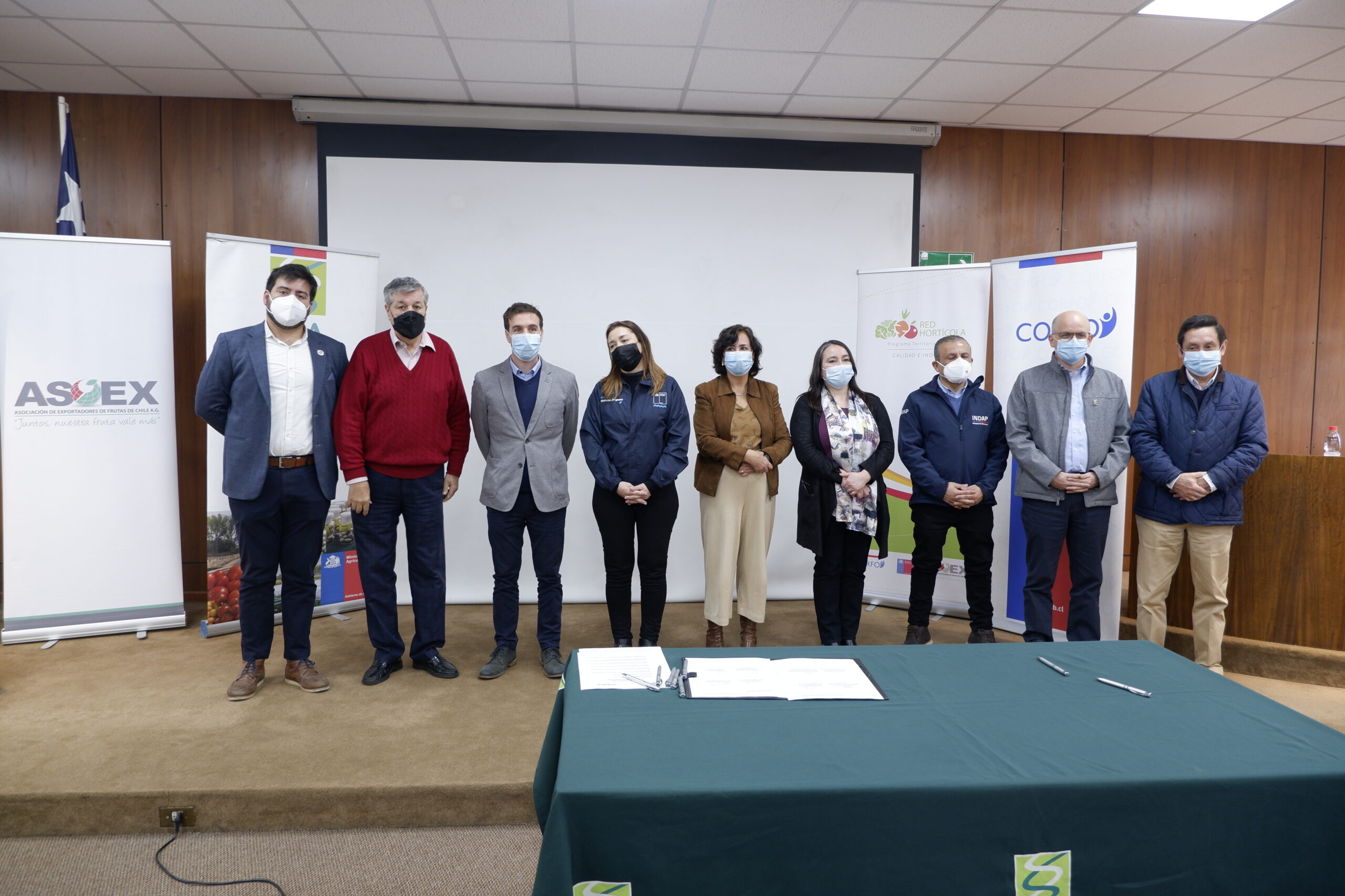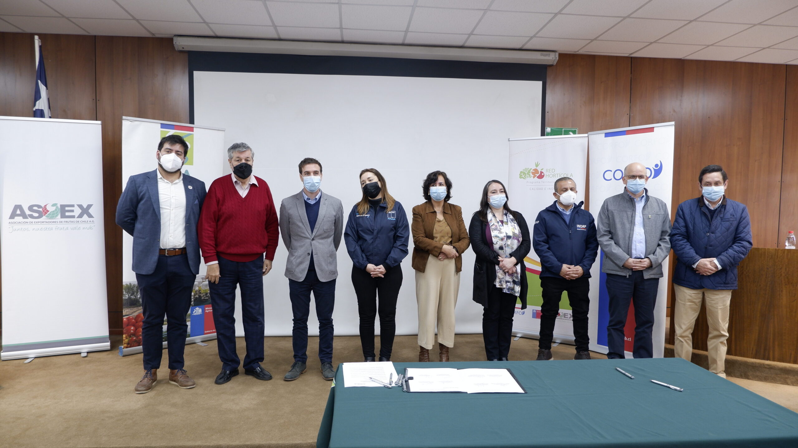 Santiago, 30 de agosto de 2022.- Con el fin de incorporar una estrategia de gestión productiva y de recursos para aumentar la eficiencia y la competitividad del sector hortícola, el Gobierno Regional Metropolitano firmó un Acuerdo de Producción Limpia con la Asociación de Exportadores de Fruta de Chile (ASOEX) y la Agencia de Sustentabilidad y Cambio Climático (ASCC), que contribuirá al desarrollo sustentable de 25 agricultores de Melipilla, Lampa y Paine.