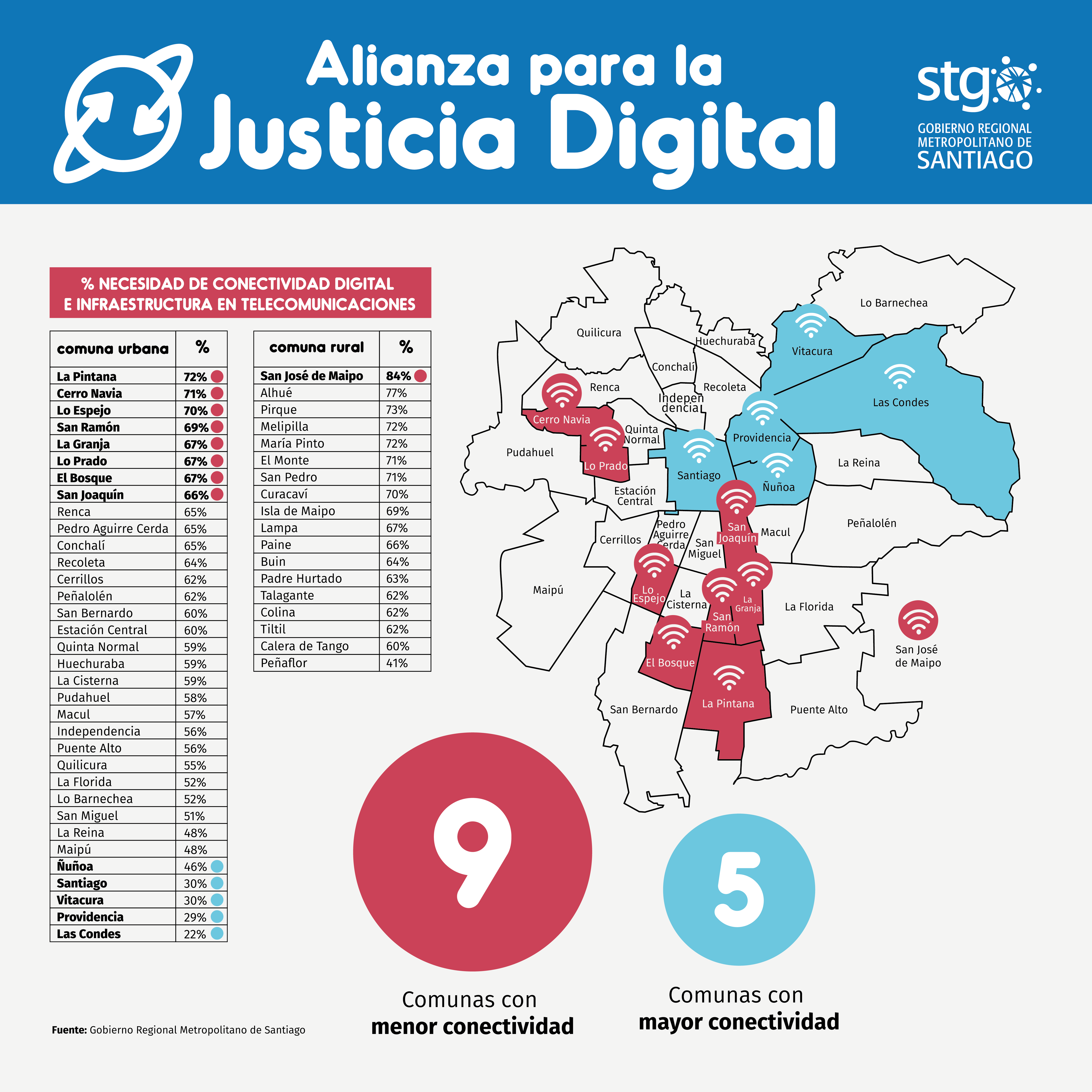 Por tal motivo, el Gobierno Regional Metropolitano de Santiago convocó a los alcaldes y alcaldesas de las nueve comunas de la región con mayor necesidad de conectividad digital e infraestructura en telecomunicaciones para conformar, junto a más de 20 empresas privadas de Internet y otros servicios, una Alianza para la Justicia Digital. De esta forma, se priorizará mejorar y aumentar el servicio en La Pintana, Cerro Navia, Lo Espejo, San Ramón, La Granja, Lo Prado, EL Bosque, San Joaquín y San José de Maipo.