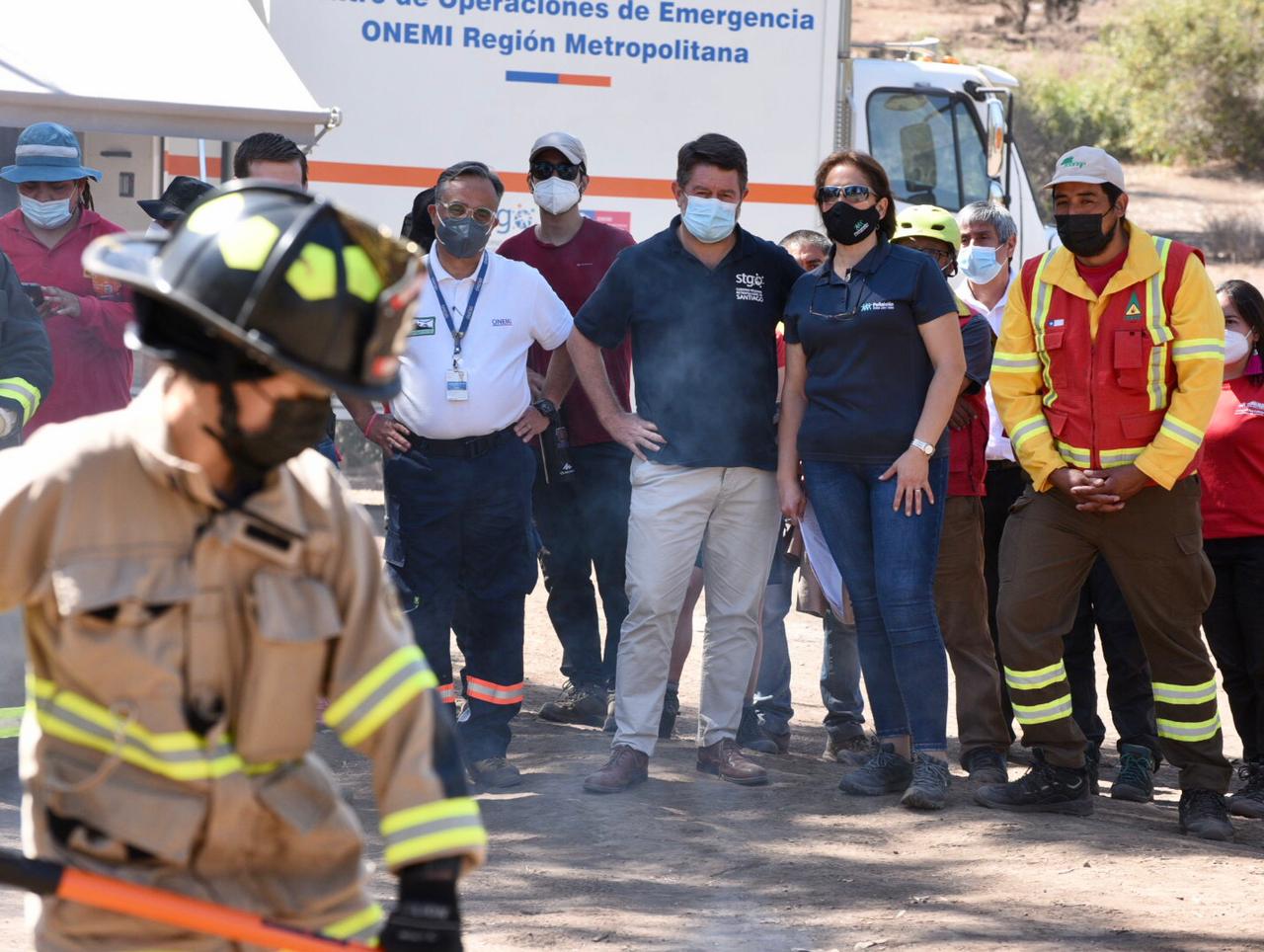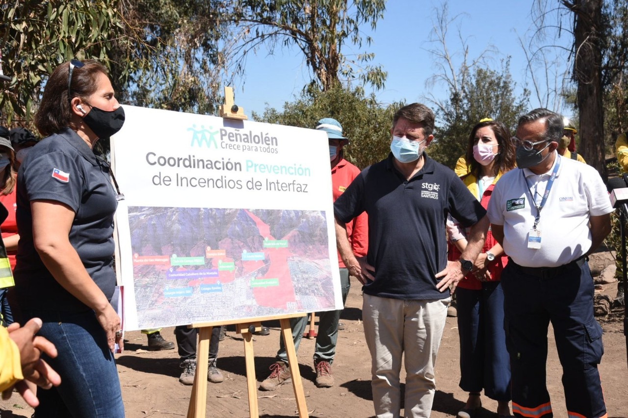 Santiago, 03 de enero de 2022.- Con un simulacro de incendio controlado, trabajo de cortafuegos y plan de manejo intersectorial en caso de incendios, el Gobernador de la Región Metropolitana, Claudio Orrego, junto a la alcaldesa de Peñalolén, Carolina Leitao, el Director Regional de ONEMI, Miguel Muñoz, el Jefe de la sección de Operaciones CONAF RM, Rodrigo Fernández y el Director de la Octava Compañía de Bomberos de Peñalolén, Rubén Segura, lanzó el Plan Verano contra Incendios Forestales 2022.