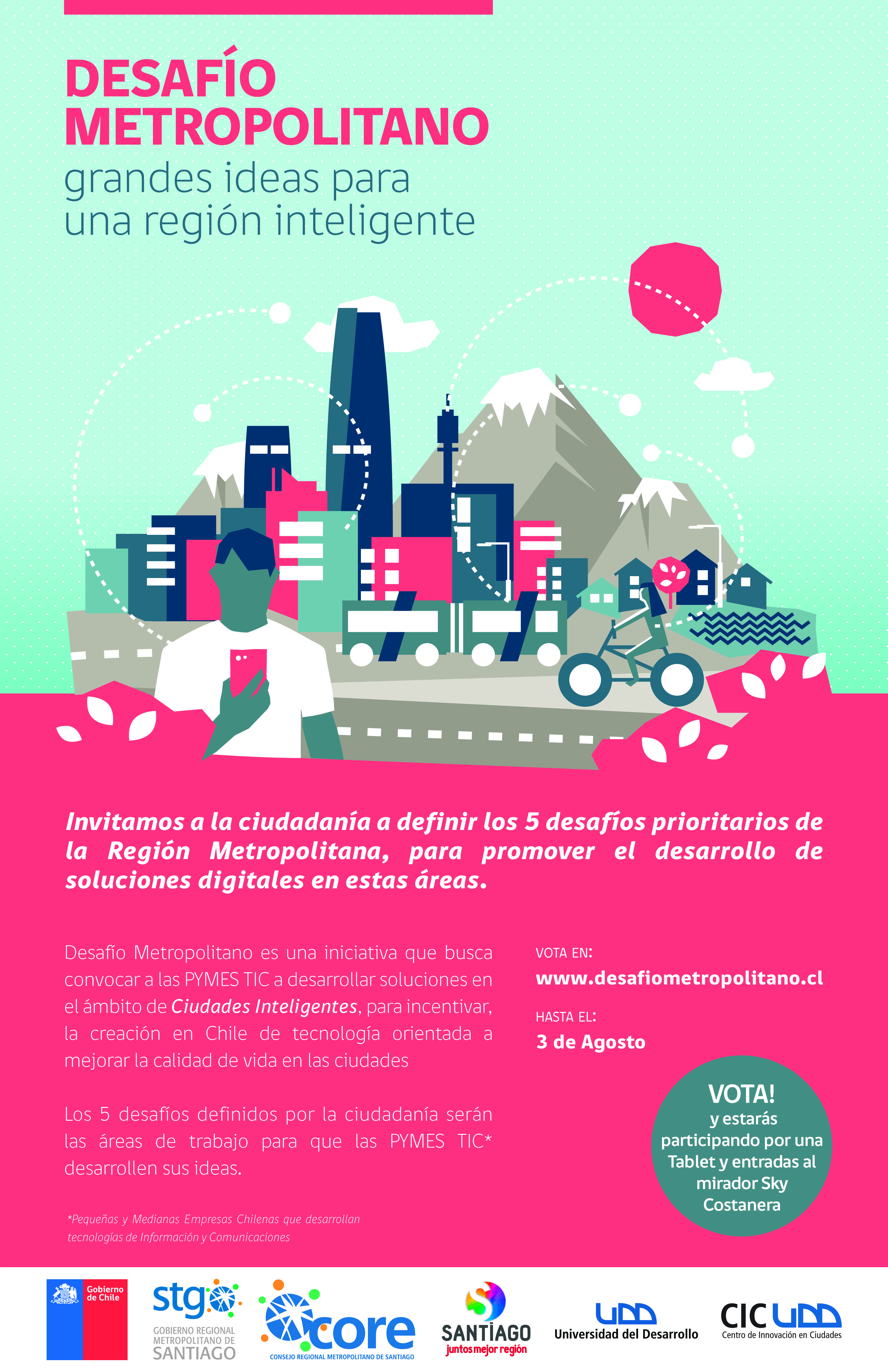 Mejorar la calidad de vida de todos los habitantes de la ciudad aprovechando la tecnología, es el objetivo de la iniciativa “Desafío Metropolitano”: Grandes Ideas para una Región Inteligente, liderada por el Gobierno Regional Metropolitano y el Centro de Innovación en Ciudades (CIC) de la Universidad del Desarrollo (UDD), según la cual, los habitantes de la Región Metropolitana podrán votar para escoger cinco desafíos que serán abordados a través de soluciones digitales.
