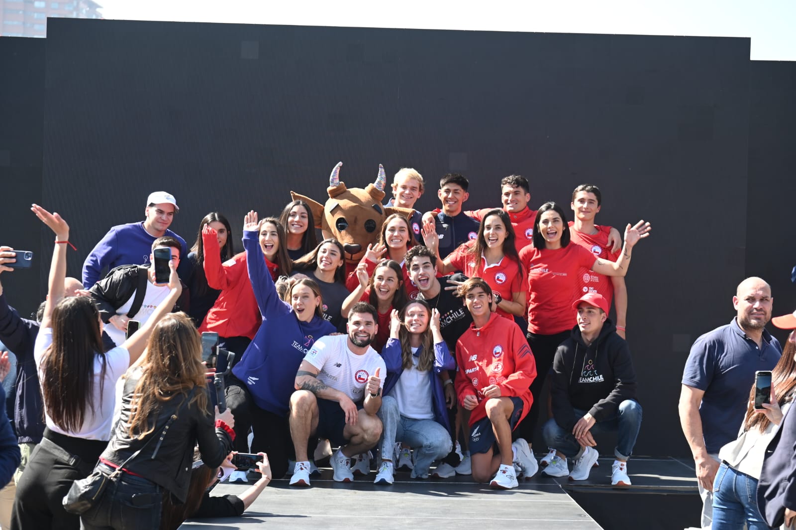 Santiago, jueves 31 de agosto de 2023.- Una veintena de representantes del Team Chile liderados por el abanderado nacional, Esteban Grimalt, fueron protagonistas de un desfile en medio del Parque Araucano de Las Condes.