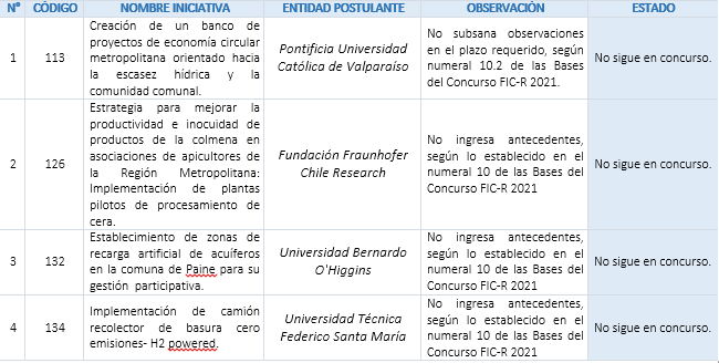 Del total de proyectos admisibles (45), 4 iniciativas no cumplieron con los requerimientos establecidos en el numeral 10 de las Bases del Concurso FIC-R 2021, por lo que no continúan en concurso: