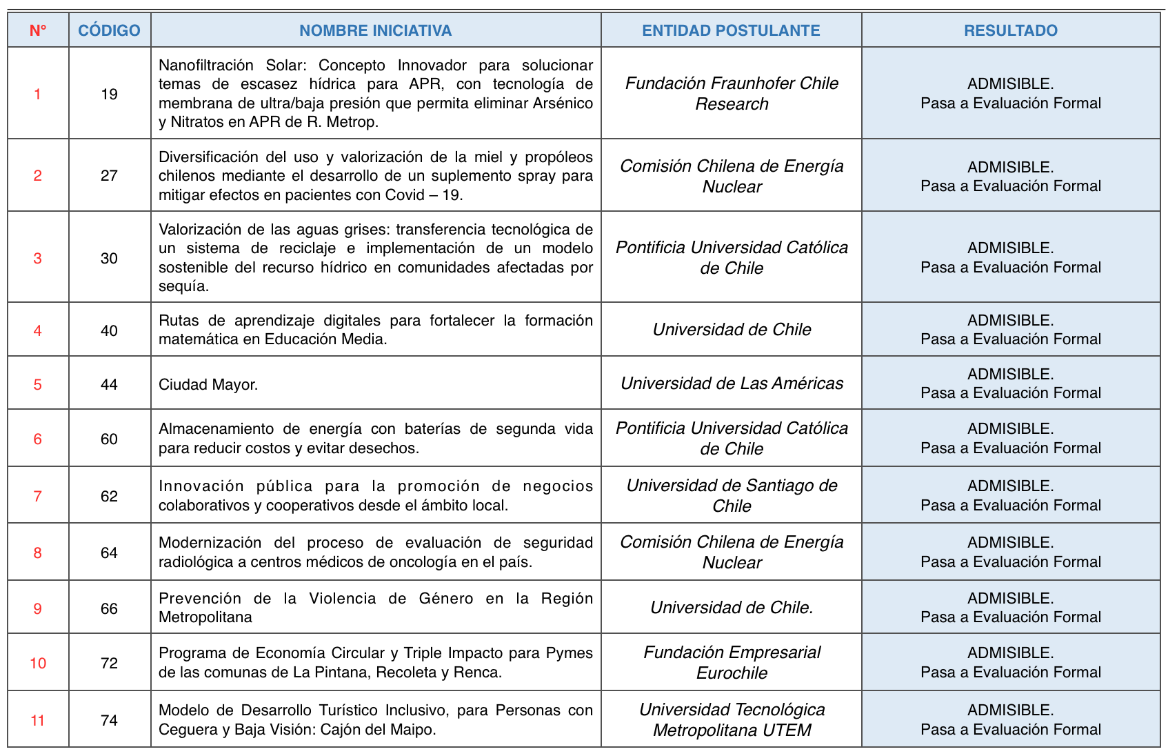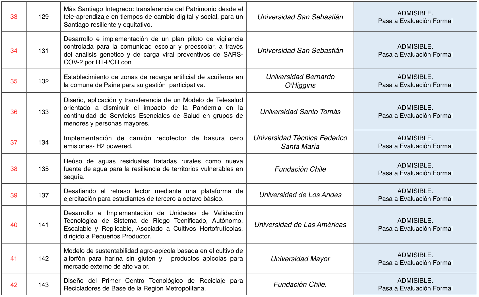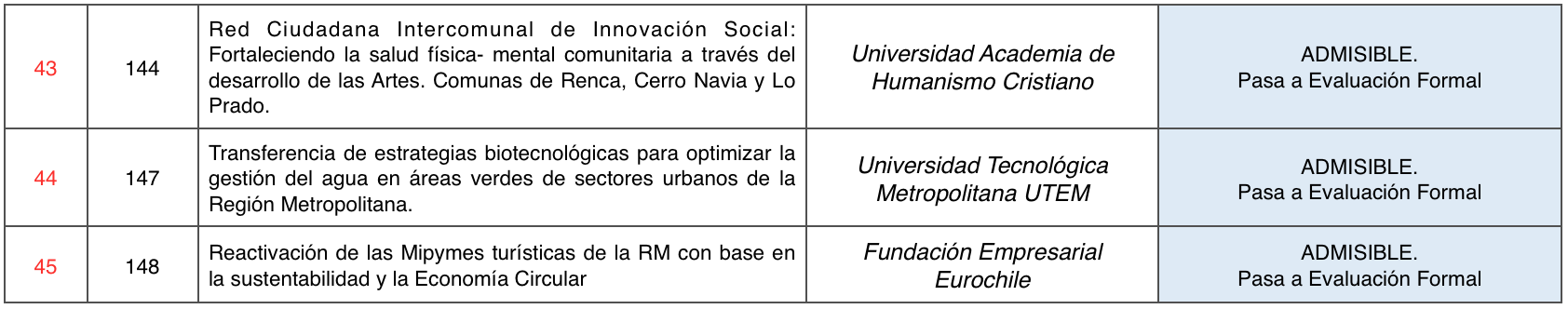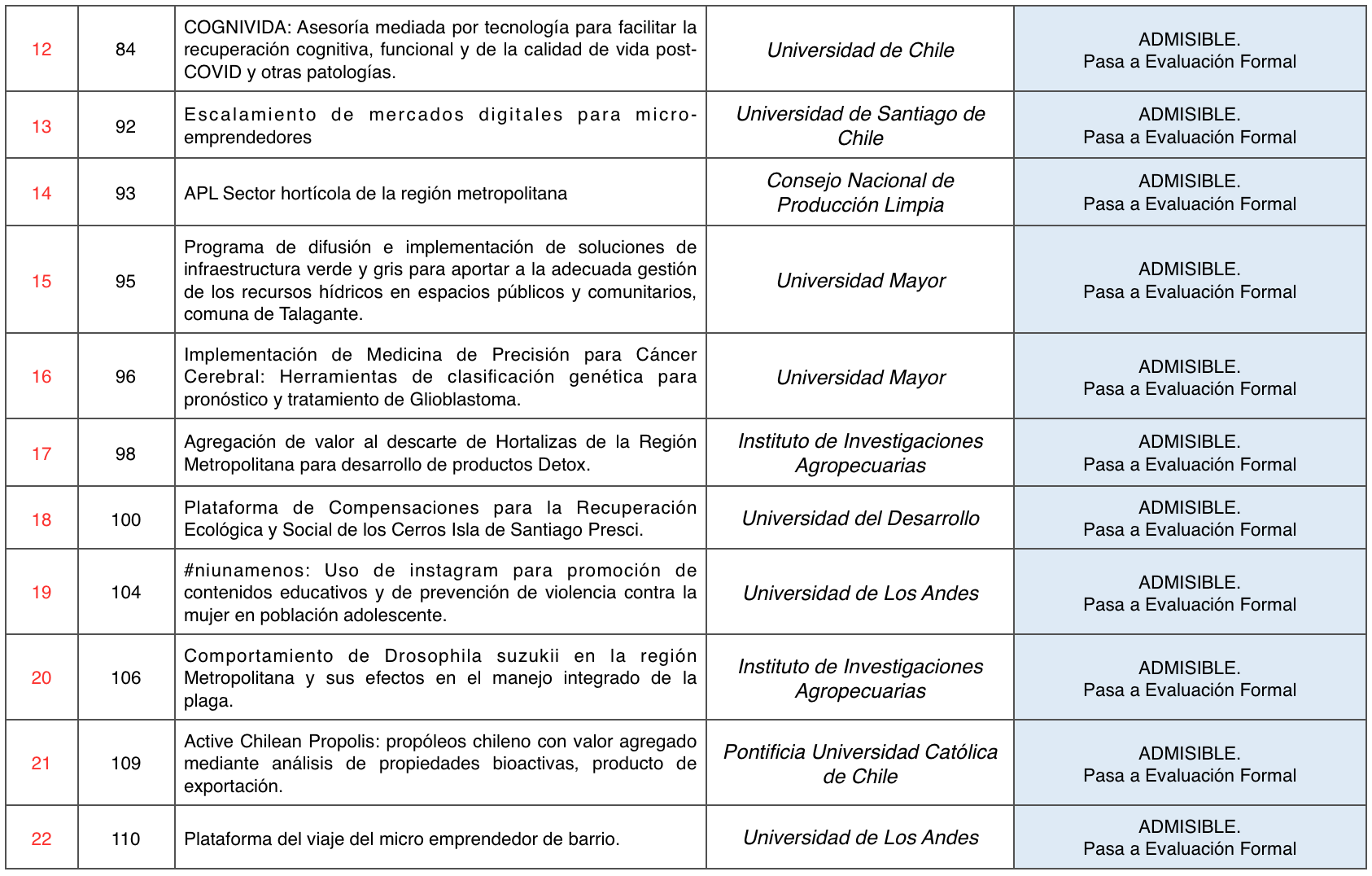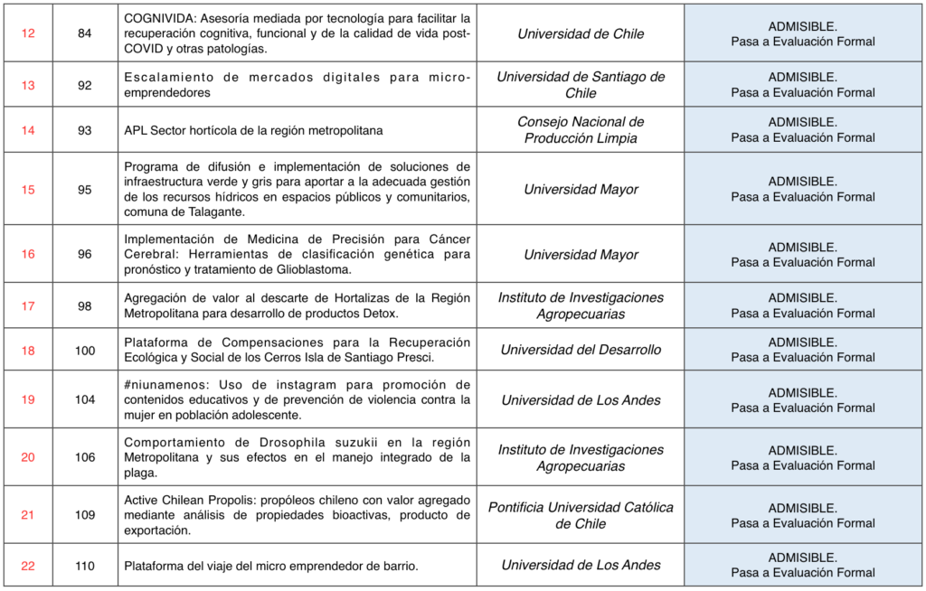 Las iniciativas declaradas Admisibles avanzan a la Etapa de Evaluación Formal, por lo que deben ingresar los antecedentes indicados en el numeral 10.1 de las Bases del Concurso FIC-R 2021.