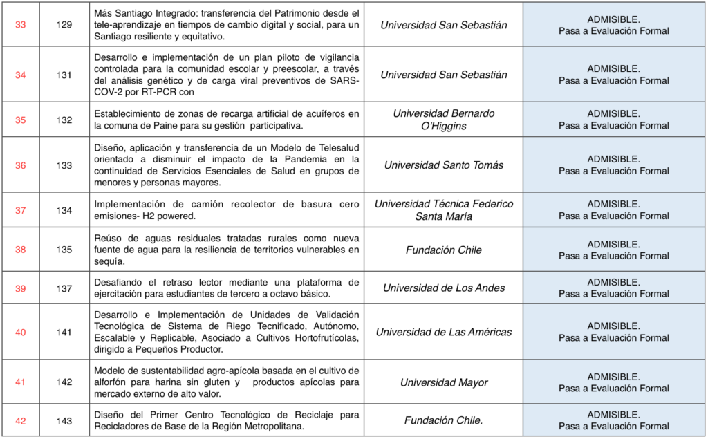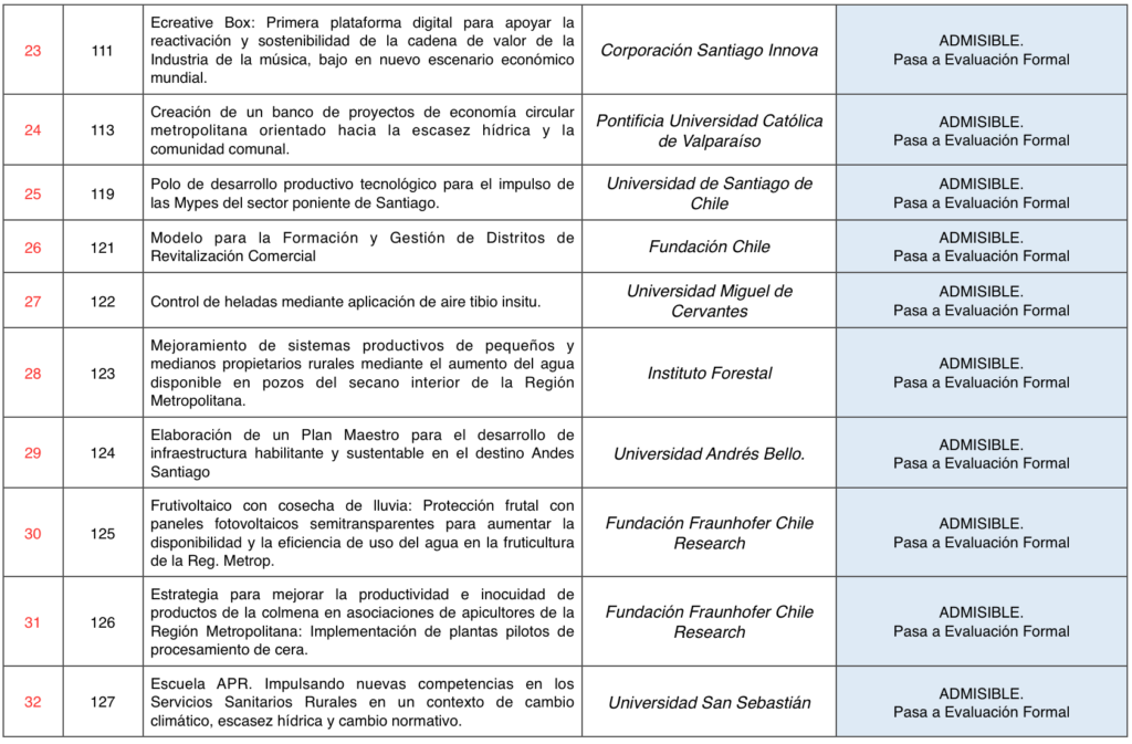 Santiago, 23 de agosto de 2021.- El Gobierno Regional Metropolitano de Santiago publica el resultado de la Etapa de Evaluación de Admisibilidad de los proyectos en postulación al Concurso FIC-R 2021.