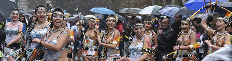 Pese al sistema frontal que afectó a Santiago, miles de personas se quedaron en las cercanías de La Moneda aprovechando el Día del Patrimonio, para disfrutar de los carros alegóricos y las comparsas que ocuparon la calzada sur de La Alameda.