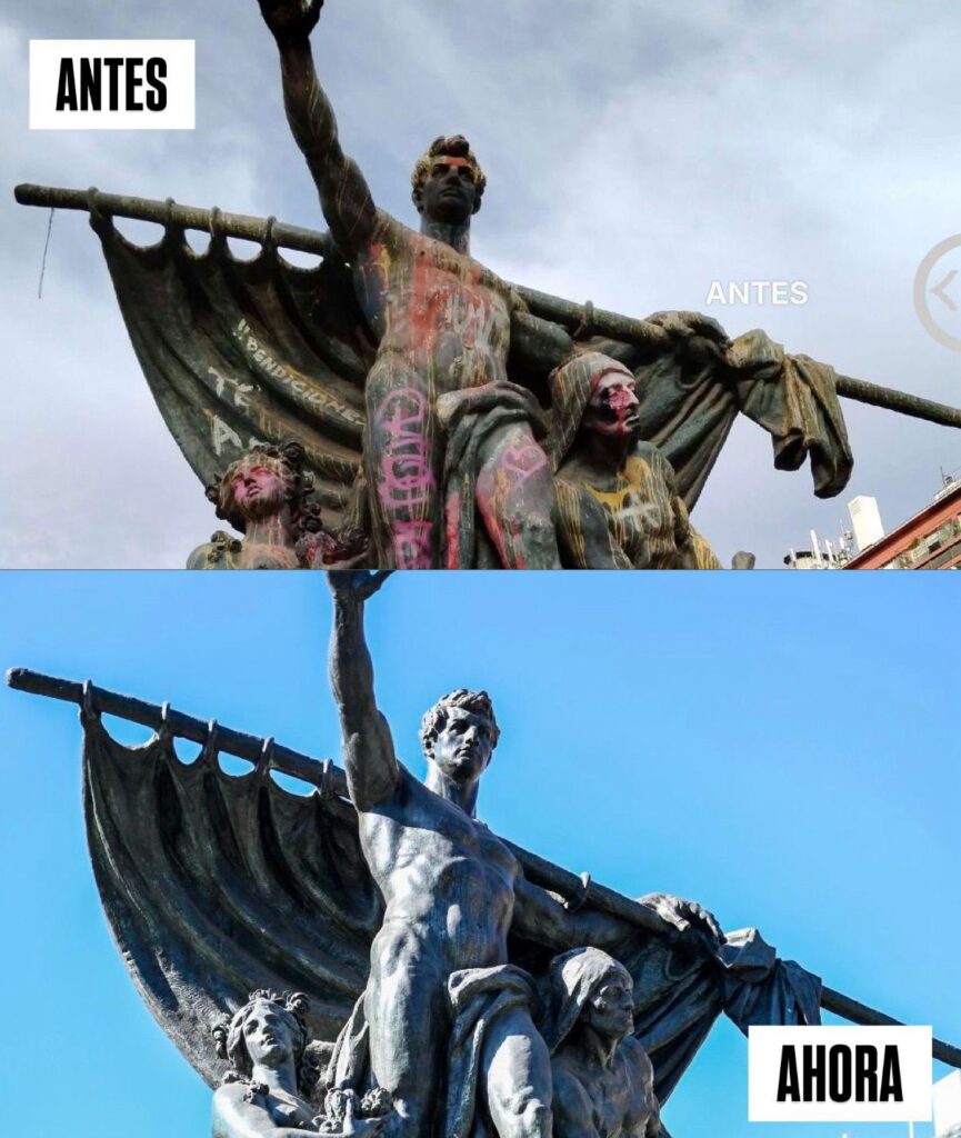 El resultado salta a la vista: el conjunto escultórico luce nuevamente limpio, iluminado y con su sistema de agua en funcionamiento, tal como cuando fue inaugurado en 1912. La restauración incluyó la eliminación de grafitis, la limpieza de elementos de bronce y granito, y la recuperación de detalles que el paso del tiempo había dejado en el olvido.