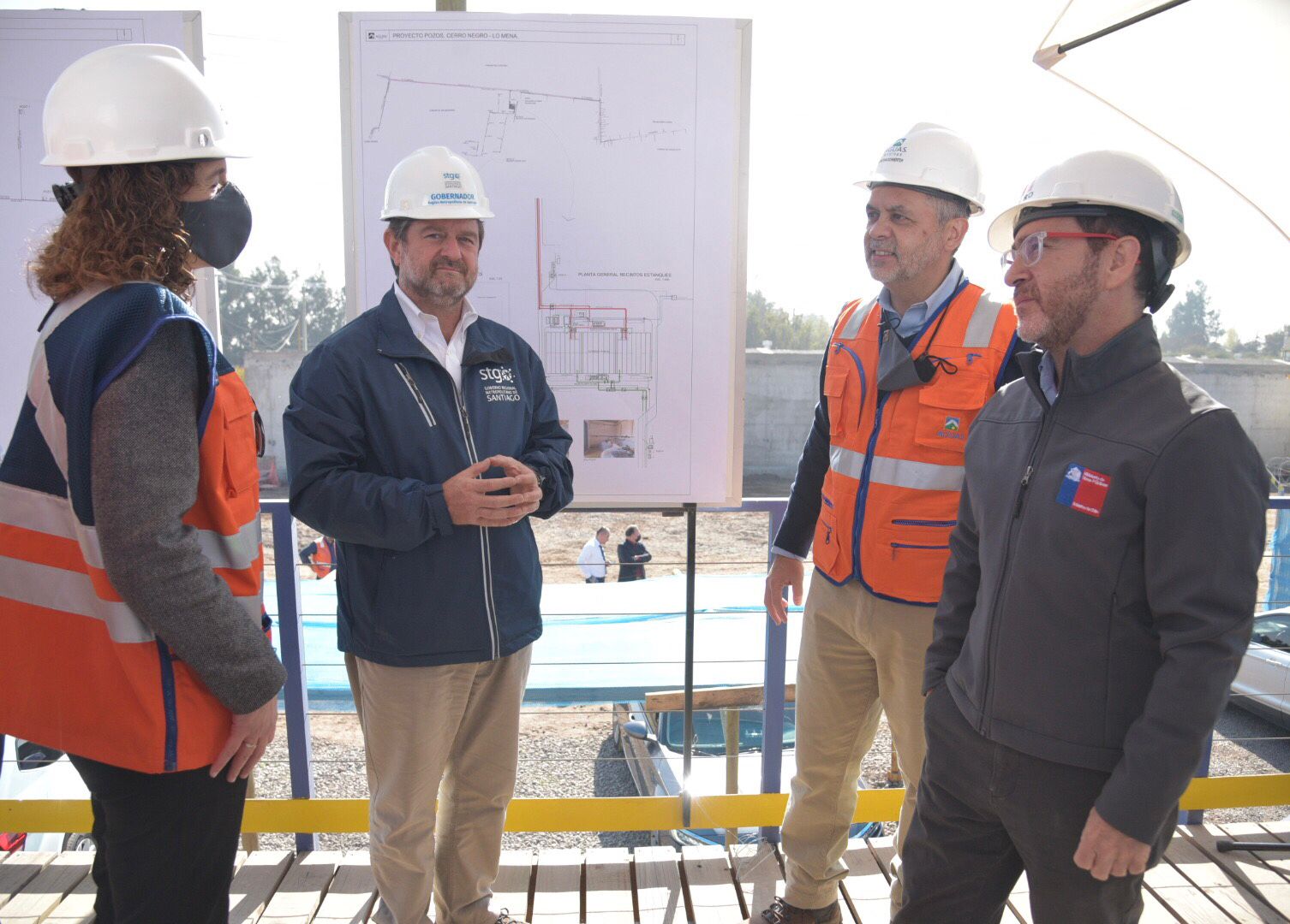 Santiago, 10 de mayo de 2022.- El ministro de Obras Públicas, Juan Carlos García, junto al gobernador de la Región Metropolitana, Claudio Orrego, al jefe de Concesiones de la Superintendencia de Servicios Sanitarios, Álvaro Sola, y a la gerenta general de Aguas Andinas, Marta Colet, realizaron esta mañana una visita inspectiva a los trabajos de construcción de los nuevos Pozos Cerro Negro-Lo Mena, iniciativa ubicada en la comuna de San Bernardo, que permitirá abastecer con agua potable a cerca de 400 mil personas de la zona sur-poniente de la región.