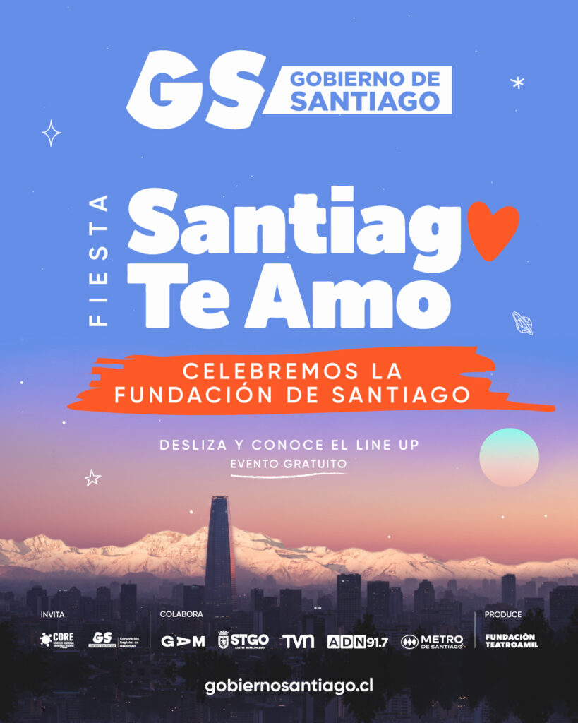 Santiago 12 de febrero 2025.- Este sábado 15 de febrero se realizará la primera fiesta “Santiago Te Amo”, evento gratuito organizado por el Gobierno de Santiago y producido por la Fundación Teatro a Mil, esta celebración contará con actividades para todas las edades. El evento se tomará por completo la Alameda, por eso, revisa y conoce aquí todos los detalles de cortes de tránsito, horarios y los artistas que se presentarán para celebrar a lo grande el cumpleaños 484 de Santiago.